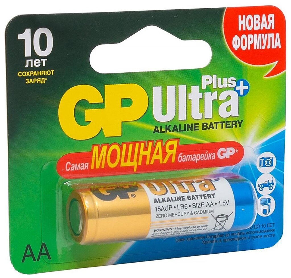 Аккумуляторы и батарейки Батарейка алкалиновая GP Ultra Plus, AA, LR6-1BL, 1.5В, блистер, 1 шт.
