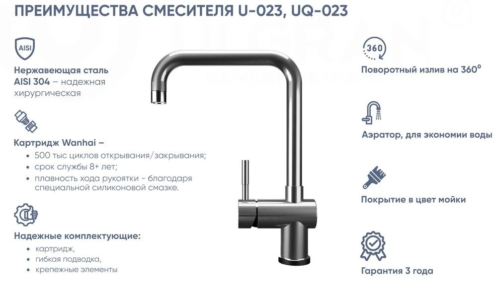 Смеситель для кухни с подключением к фильтру Ulgran нержавеющая сталь U-020 15 126 ₽ Подробнее