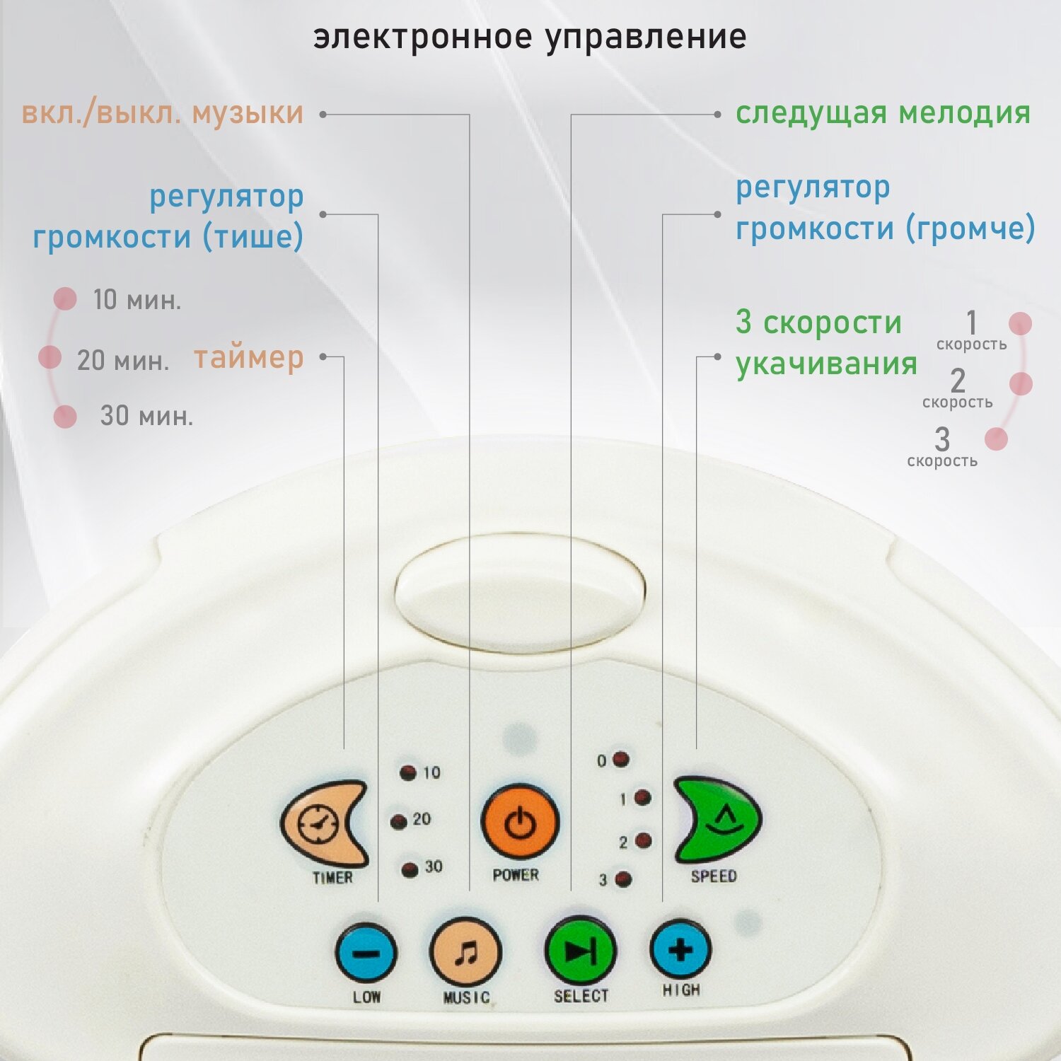 | Дополнительно | Таймер укачивания Музыкальная шкатулкаВибрационный блок (10, 20 и 30 мин) |