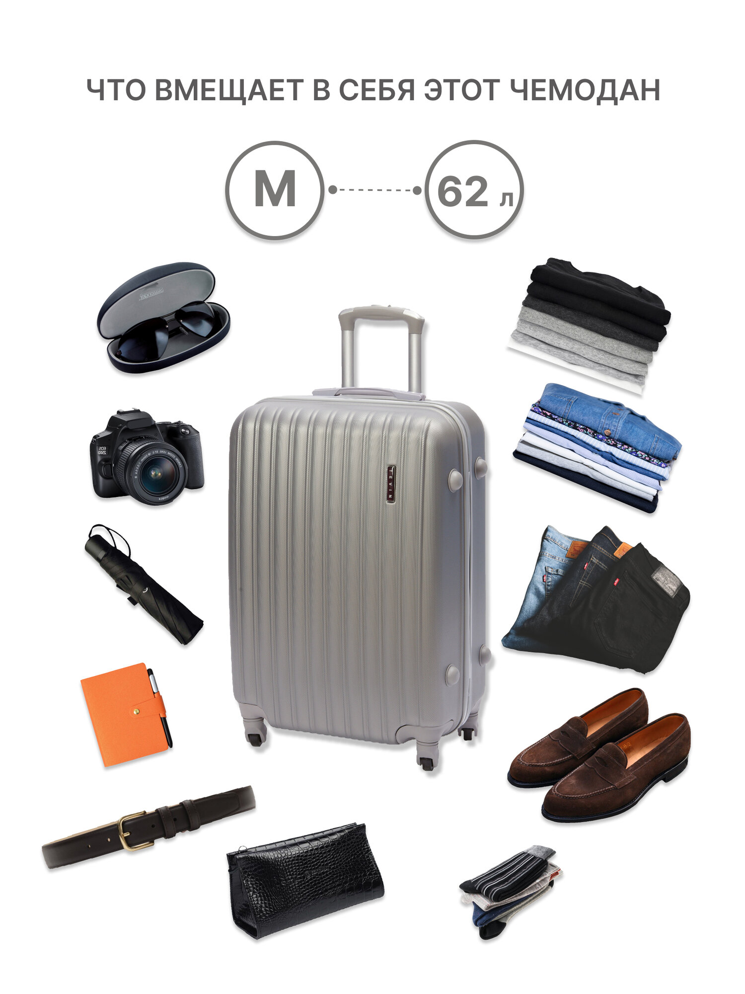 Чемодан TEVIN, 62 л, размер M, серый 7 333 ₽ Подробнее