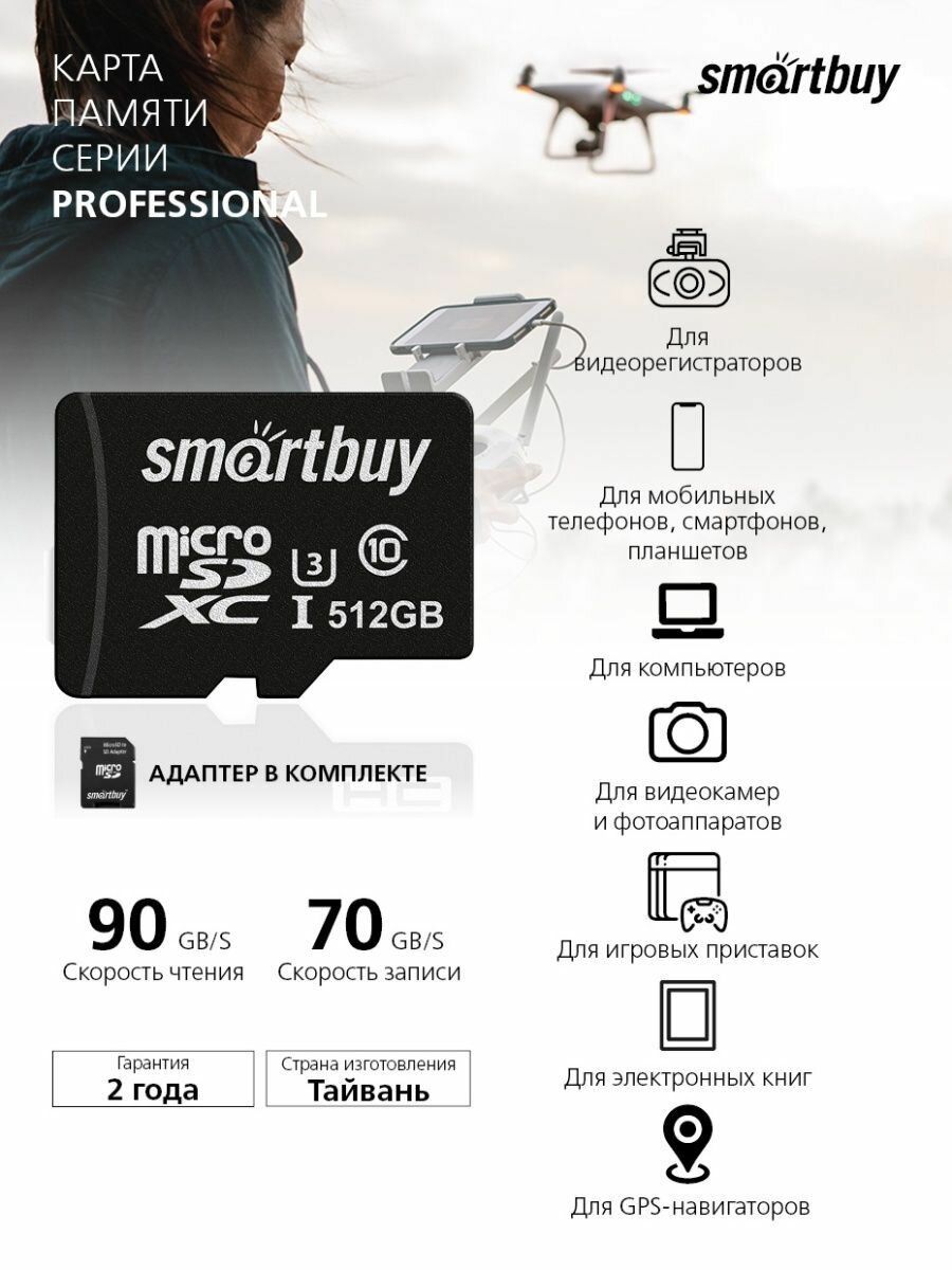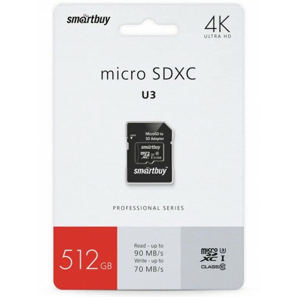 Карта памяти SmartBuy Professional Series microSDXC 512 ГБ Class 10, UHS-I U3, R/W 90/70 МБ/с, адаптер на SD, 1 шт.