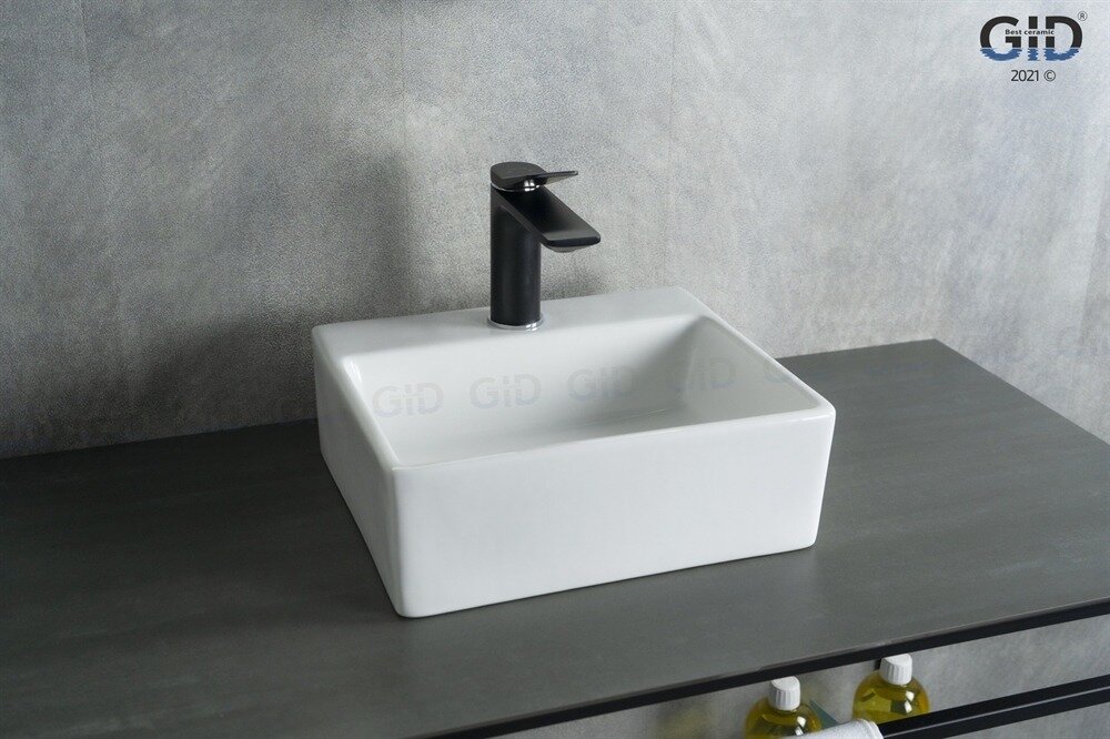 Комплект 3 предмета: Керамическая накладная/подвесная раковина для ванной Gid N9135 с сифоном А-3202 и донным клапаном хром H6717