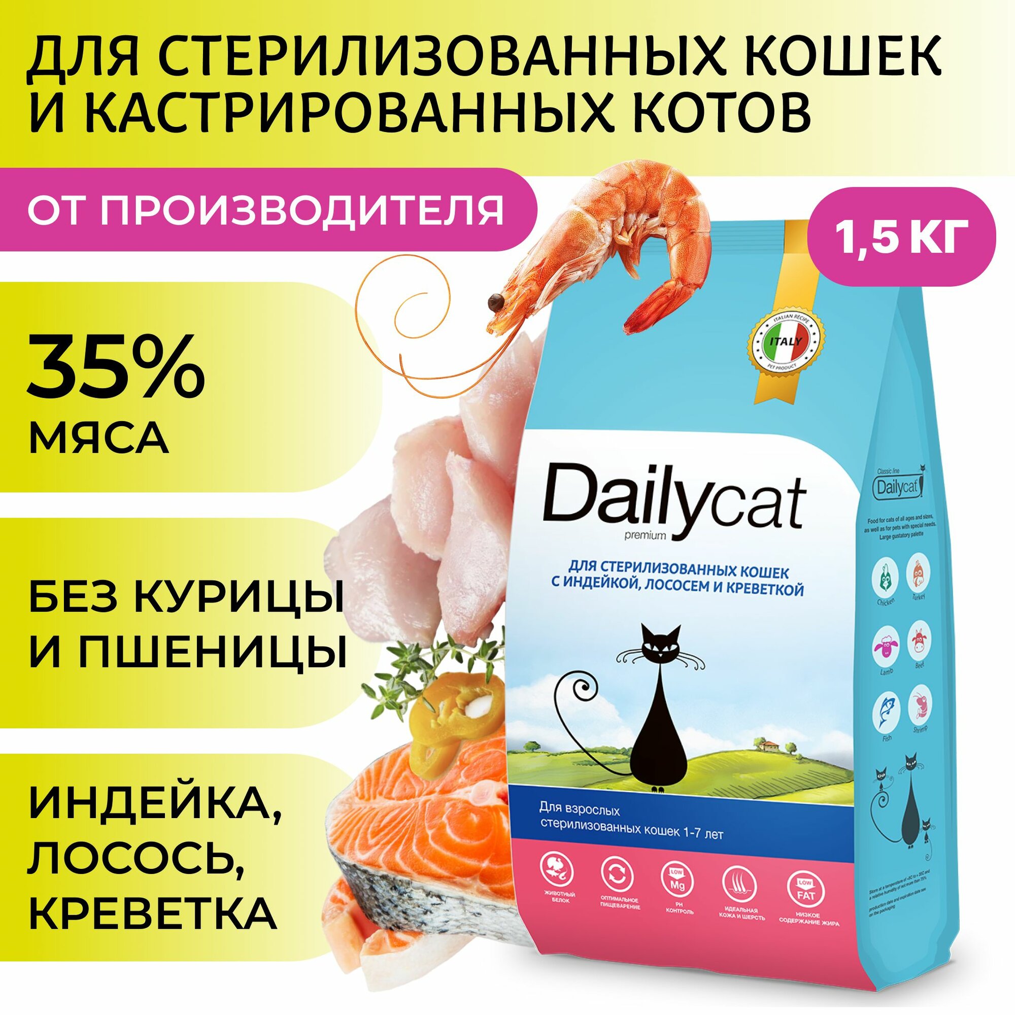 Корм для кошек Сухой корм Dailycat для стерилизованных кошек и кастрированных котов, с индейкой, лососем и креветкой, 1,5 кг