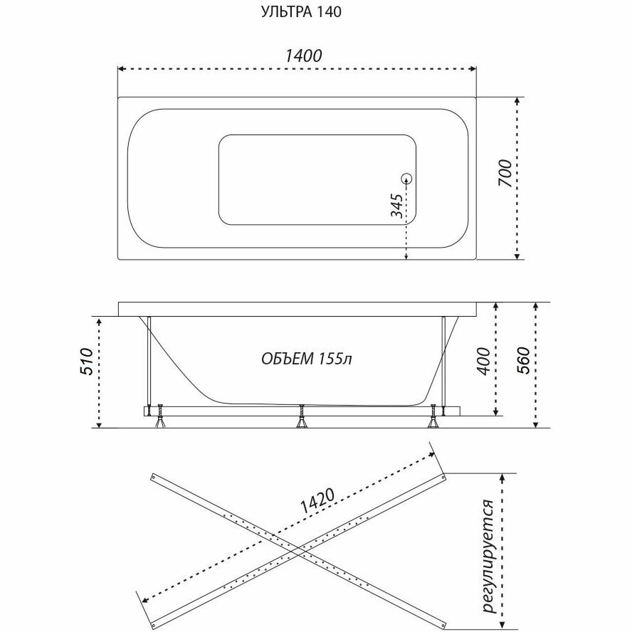 Ванны Ванна прямоугольная Тритон акриловая Ультра 1400х700х560 мм (Щ0000017118), (без монтажного комплекта/ножек)