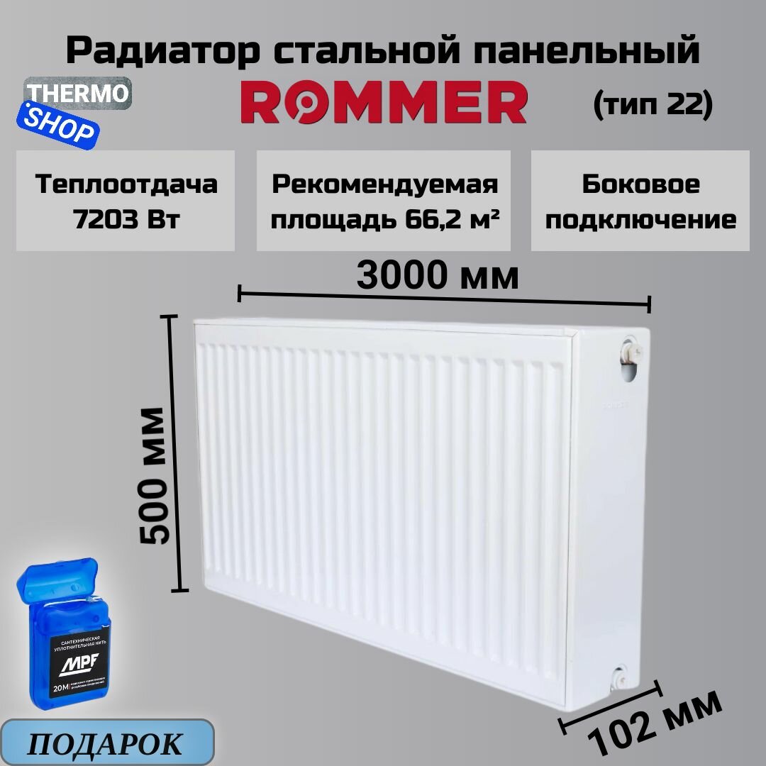 Радиаторы отопления Радиатор стальной панельный 500х3000 боковое подключение Compact 22/500/3000 Сантехническая нить 20 м