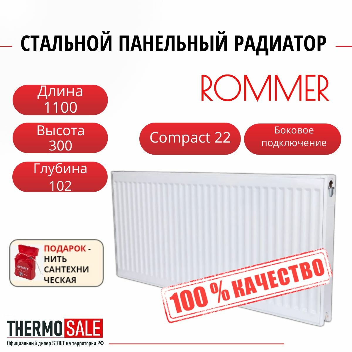 Радиаторы отопления Радиатор стальной панельный ROMMER 300х1100 боковое подключение Compact 22/300/1100 Нить сантехническая