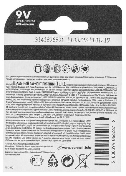 9V Батарейка Duracell Basic 6LR61/6LF22/6LP3146 MN1604, 1 шт. 600 ₽ Подробнее