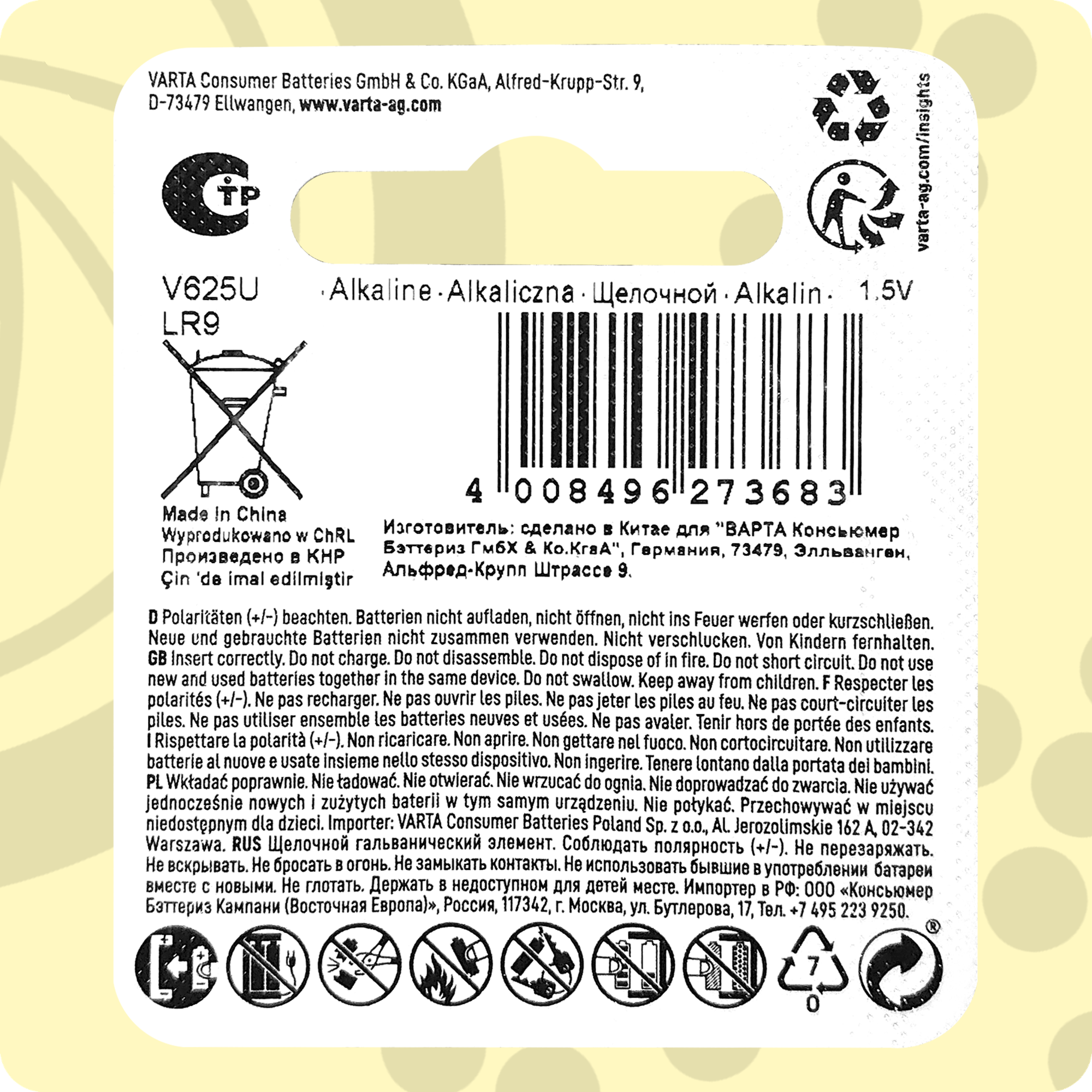 Батарейка VARTA V625U, в упаковке: 1 шт.