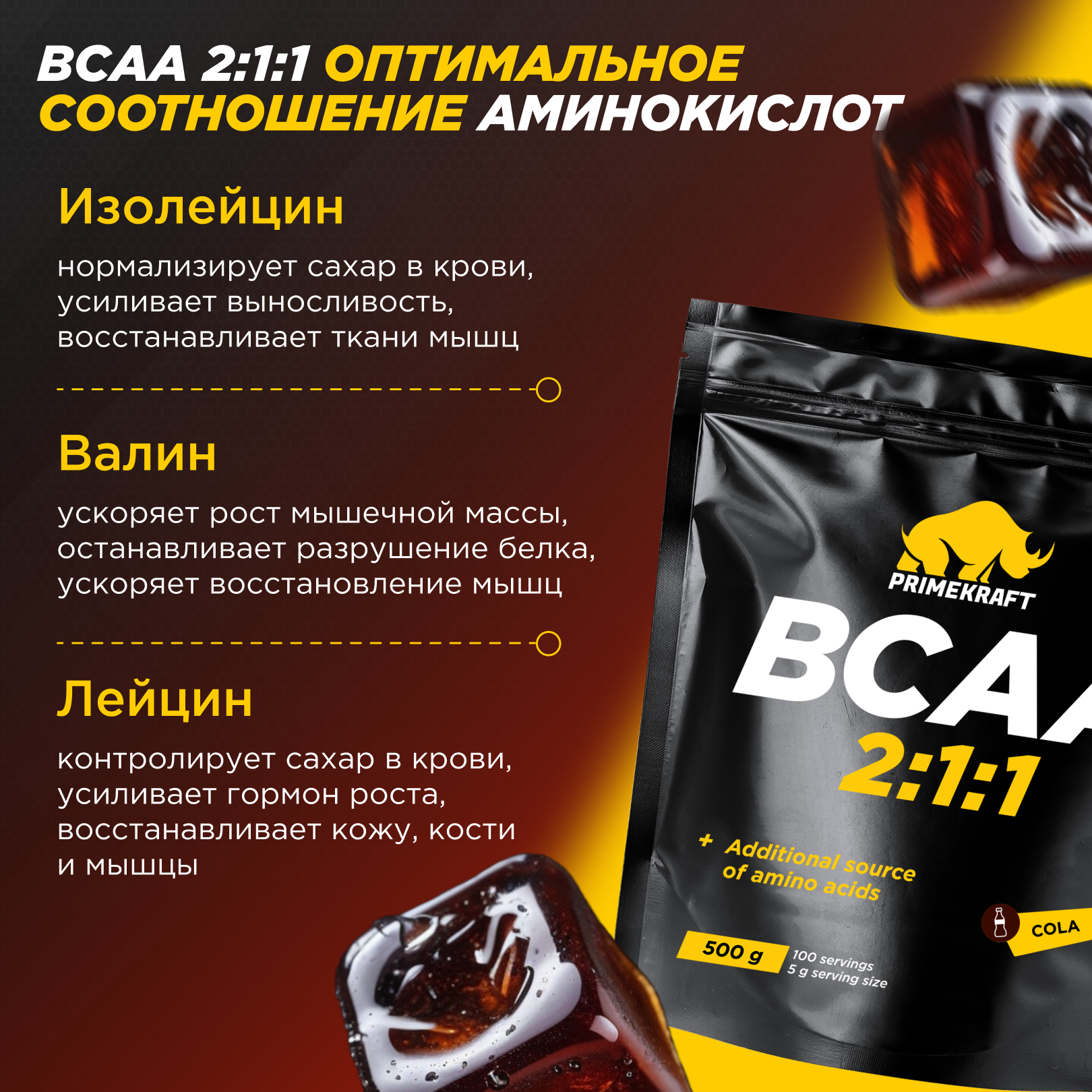 Аминокислоты BCAA спорт питание порошок 500 гр, PrimeKraft BCAA 2:1:1 , вкус: кола