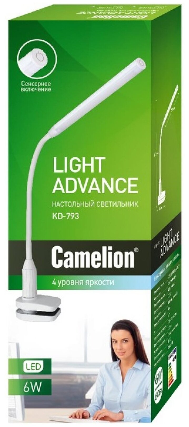 Camelion KD-793 C01 белый LED((Свет-к настол,6 Вт,зажим-струбцина,230В,сенс,4 ур.ярк,4000К)