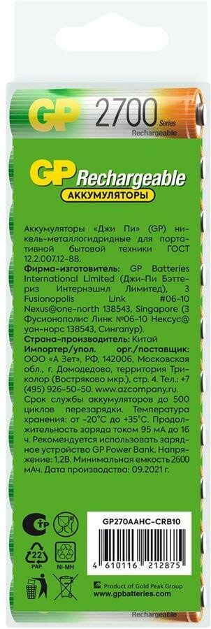 Аккумуляторная батарейка AA GP 270AAHC, в комплекте 10шт. (270AAHC-CRB10)
