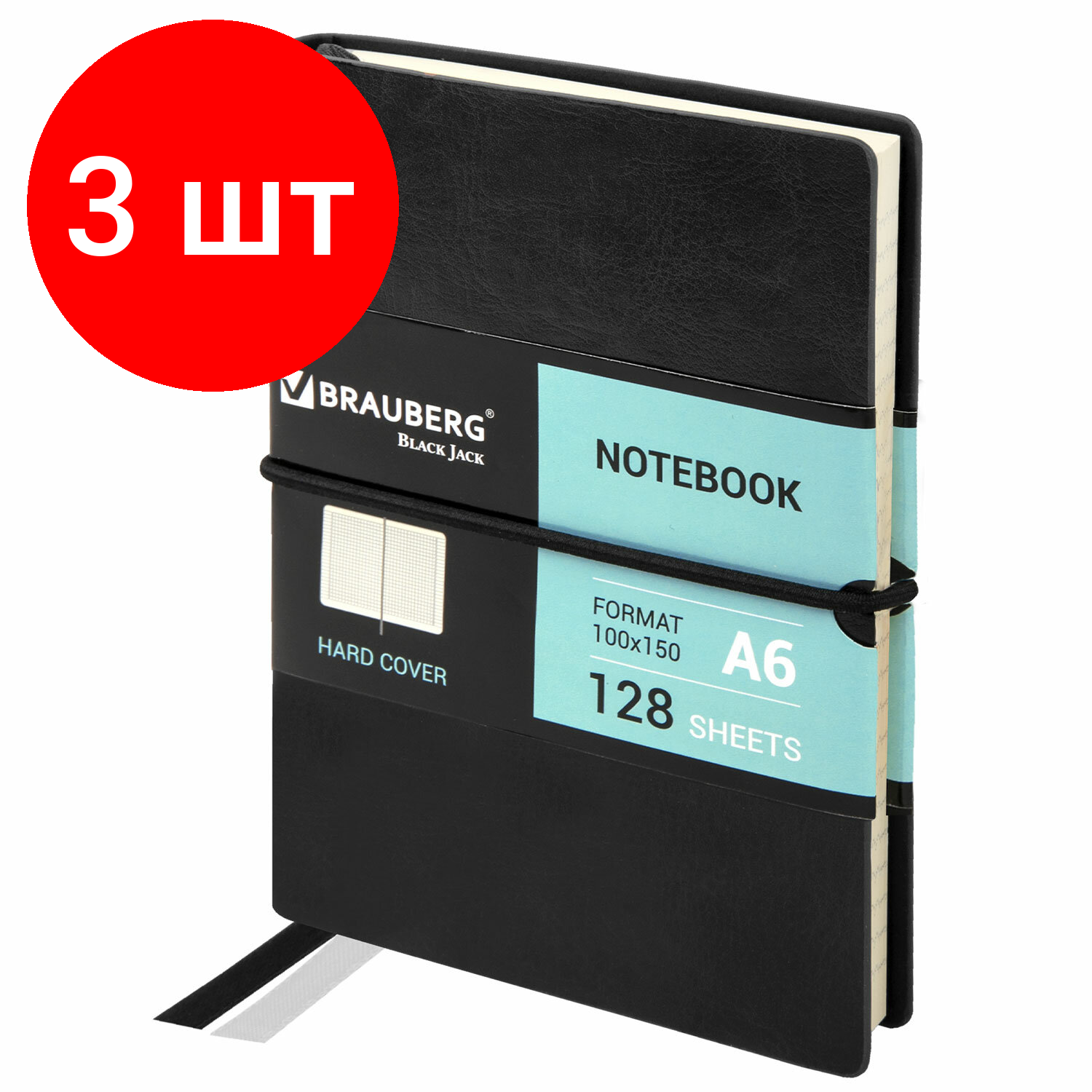 Ежедневники Комплект 3 шт, Блокнот малый формат (100х150 мм) А6, BRAUBERG "Black Jack", 128 л., гладкий кожзам, резинка, клетка, черный, 125243