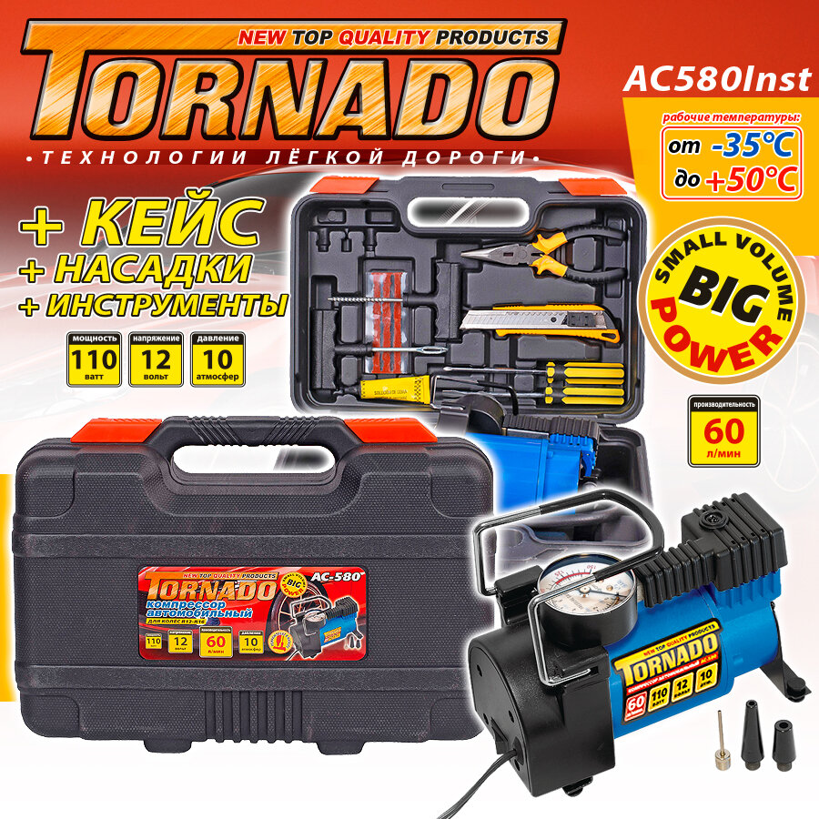 Насосы и компрессоры Компрессор автомобильный в кейсе +инструмент: жгуты, шило, клей, отвертки, пассатижи, насадки. (60л/мин, 110Вт, 10атм.) Торнадо, AC580Inst