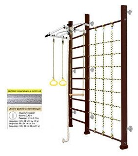Лучшие цены. Тип - спортивно-игровой комплекс; Состав - шведская стенка, турник, гимнастические кольца, канат, трапеция, сетка для лазания; Максимальная нагрузка, кг - 120; Турник съемный - есть; Хват турника - широкий; Основной материал - дерево, металл; Материал ступеней и перекладин - дерево, металл; Крепление - к стене; Размещение - в помещении; Занимаемая площадь - 1.22 м?; Размеры (ВхШхД). Магазины в вашем городе.