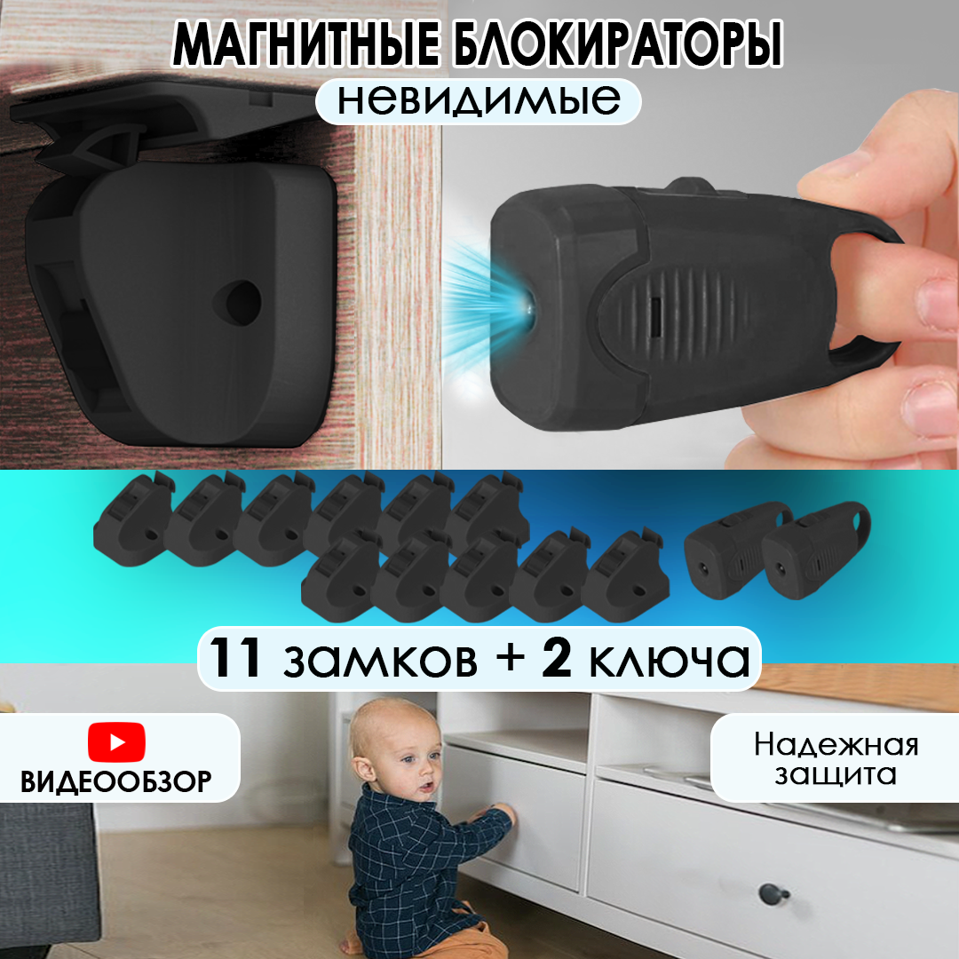Замки и блокираторы Магнитный блокиратор замок для защиты шкафов и ящиков, 11 замков и 2 ключа, черный