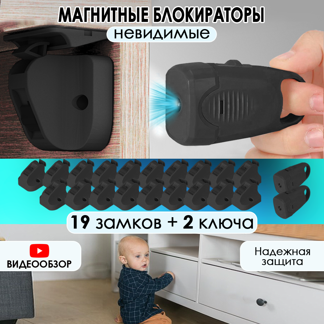 Замки и блокираторы Магнитный блокиратор замок для защиты шкафов и ящиков, 19 замков и 2 ключа, черный