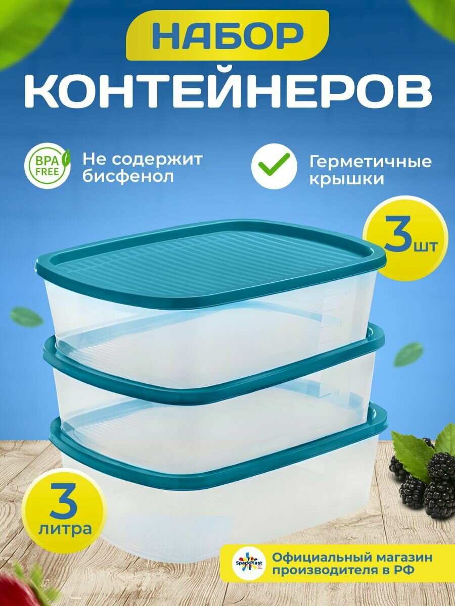 Пищевые контейнеры Контейнеры пищевые, SparkPlast, набор 3шт., по 3 л., с синей крышкой.
