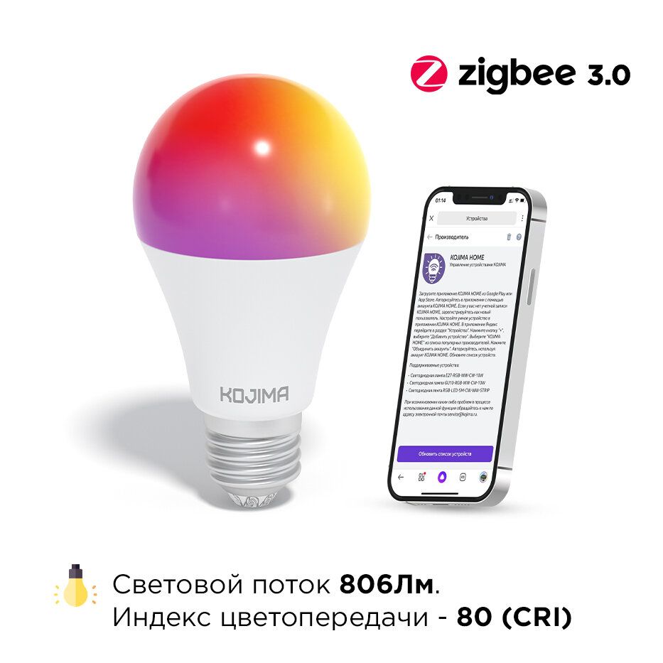 Лампочки Умная светодиодная лампочка Е27 RGB Zigbee, Яндекс Алисой, Google Home, Марусей, Smart Bulb 10W