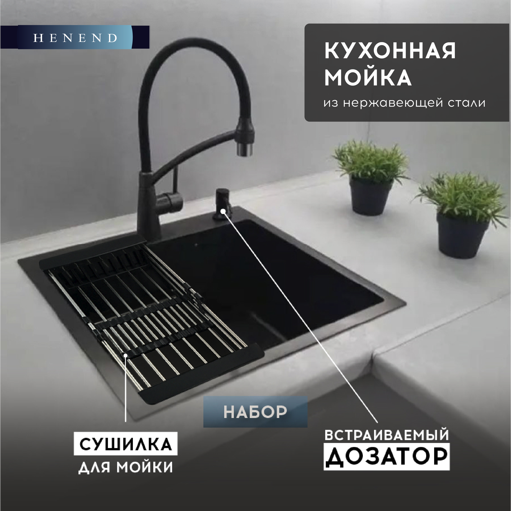 Кухонные мойки Мойка для кухни Henend 50x45B с дозатором и сушилкой