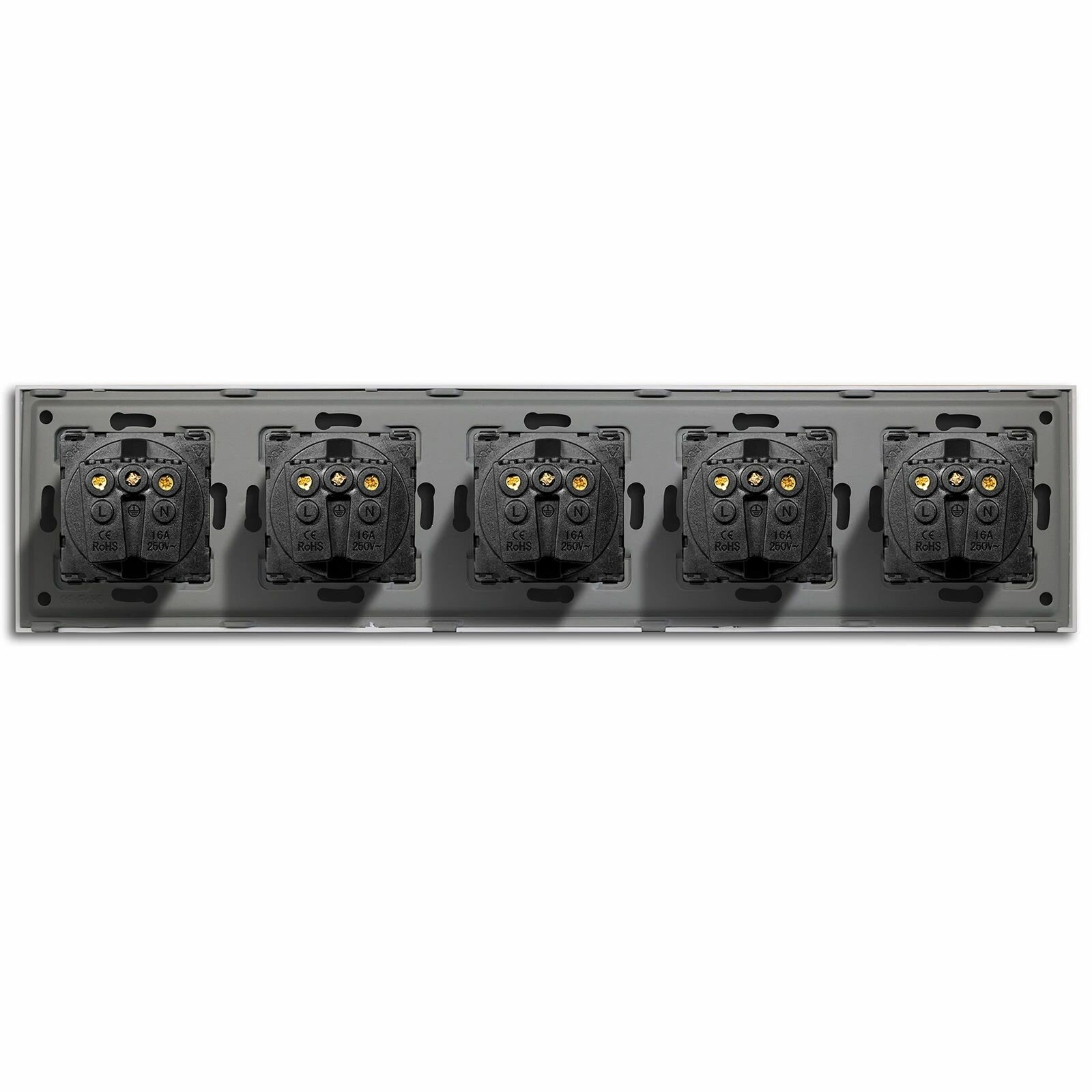 Розетки Розетка электрическая 5 постов 16А, рамка 370х86мм стекло, цвет серый