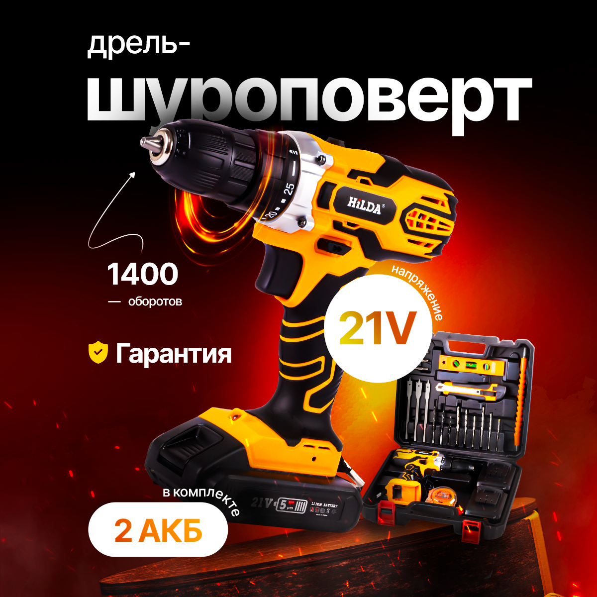 Дрели и шуруповерты Дрель-шуруповерт с двумя литиевыми батареями, 2 скорости, Hilda 21v в кейсе с инструментами