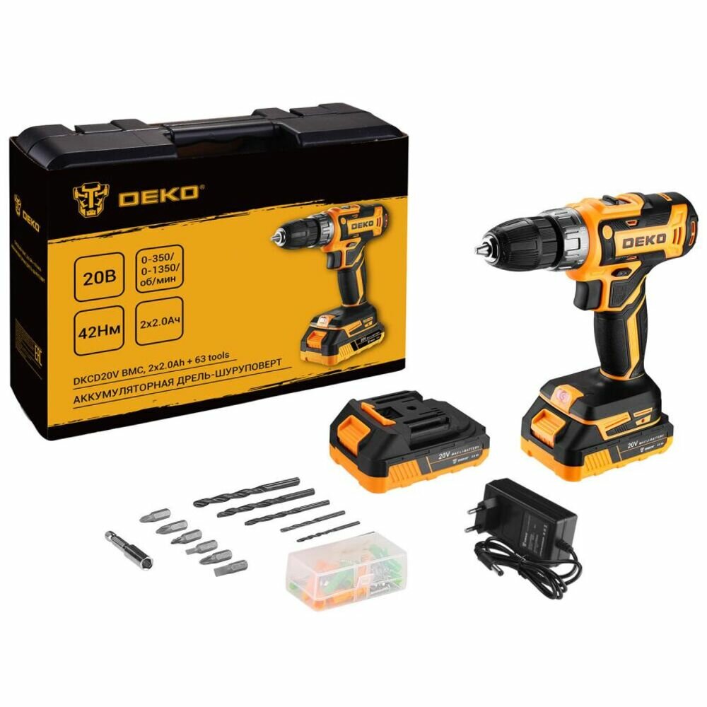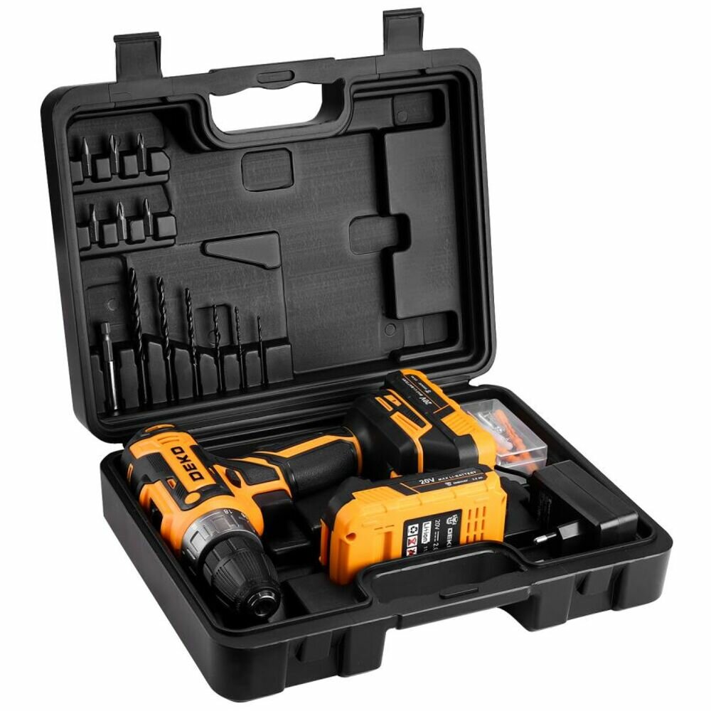 Дрели и шуруповерты Аккумуляторная дрель-шуруповерт Deko DKCD20V в кейсе + набор 63 инструмента для дома, 20В, 2х2.0Ач 080-1002