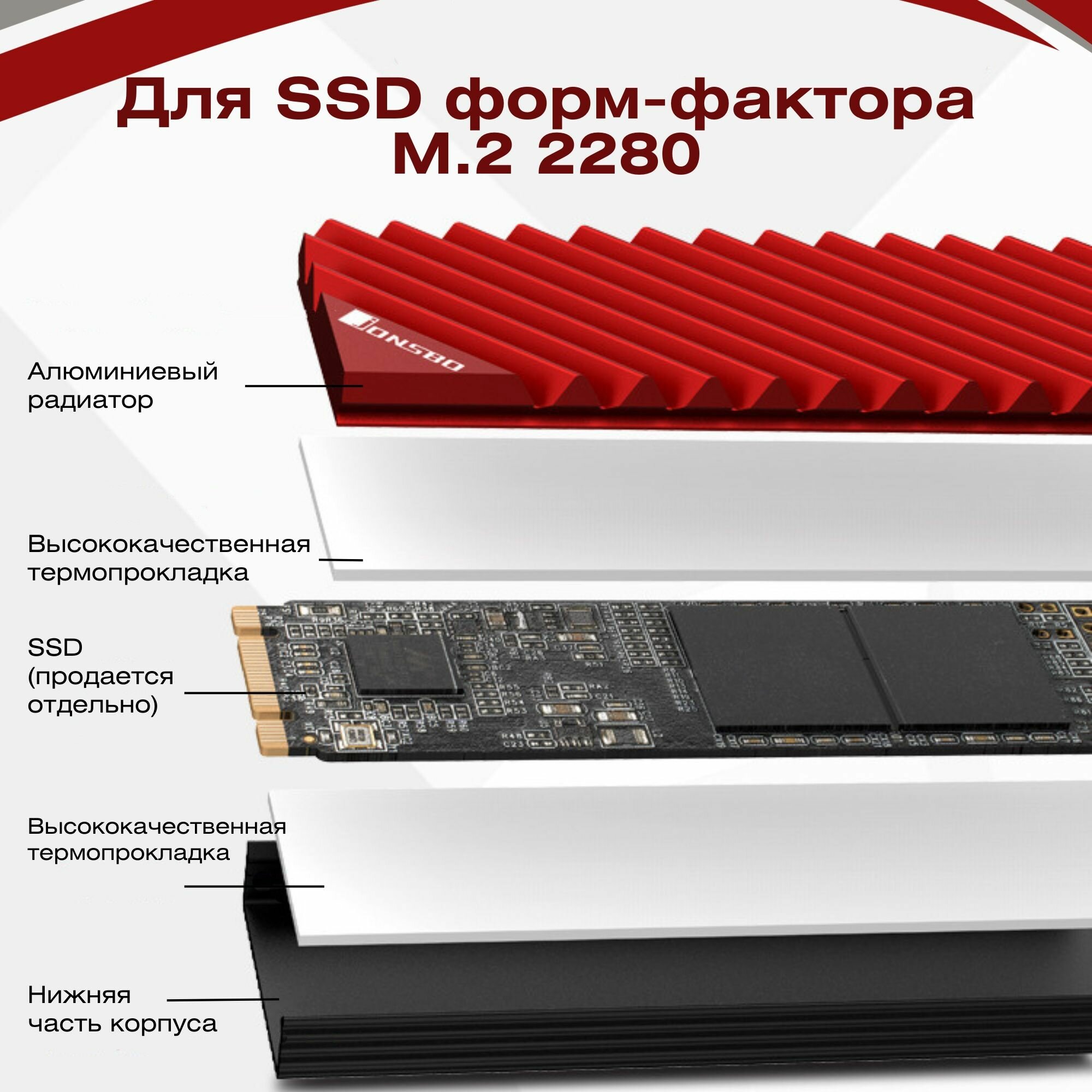 SSD-накопители Радиатор для SSD M.2 диска 2280 алюминий пассивного охлаждения + термопрокладки, красный, NVME ссд для компьютера