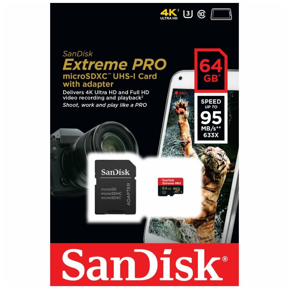 Карта памяти SanDisk Extreme PRO microSDXC 64 ГБ Class 10 UHS-I U3, V30, A2 (R/W 200/90 Mb/s) + SD адаптер