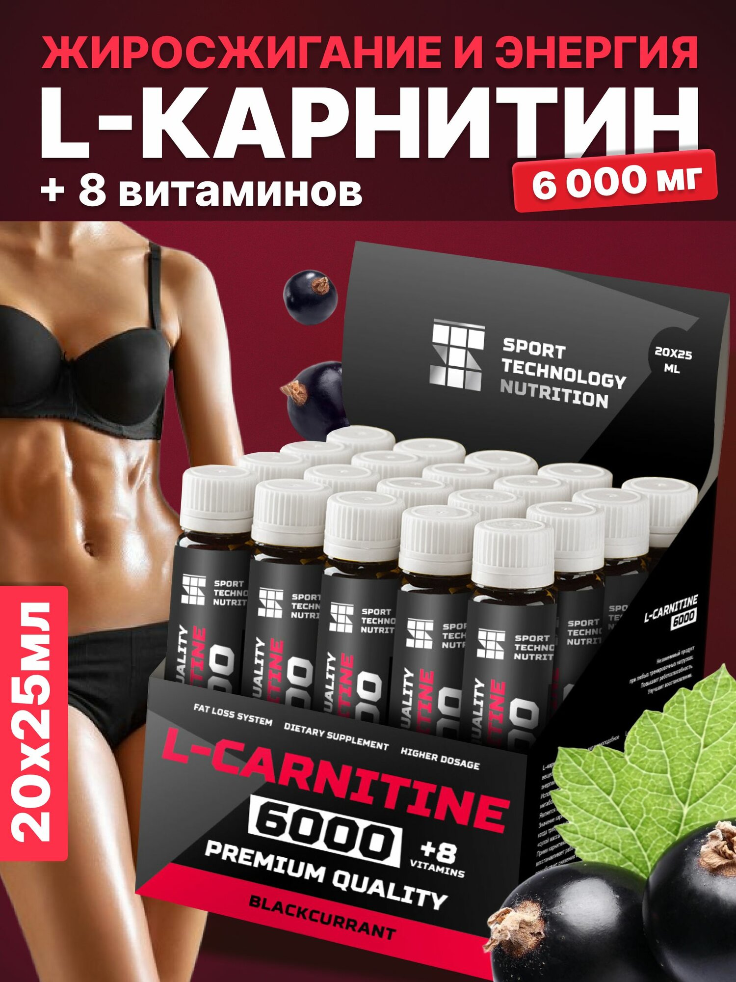 Сжигатель жира L-карнитин 6000 мг, L carnitine, 20 ампул по 25 мл, черная смородина, жиросжигатель для похудения мужчинам и женщинам
