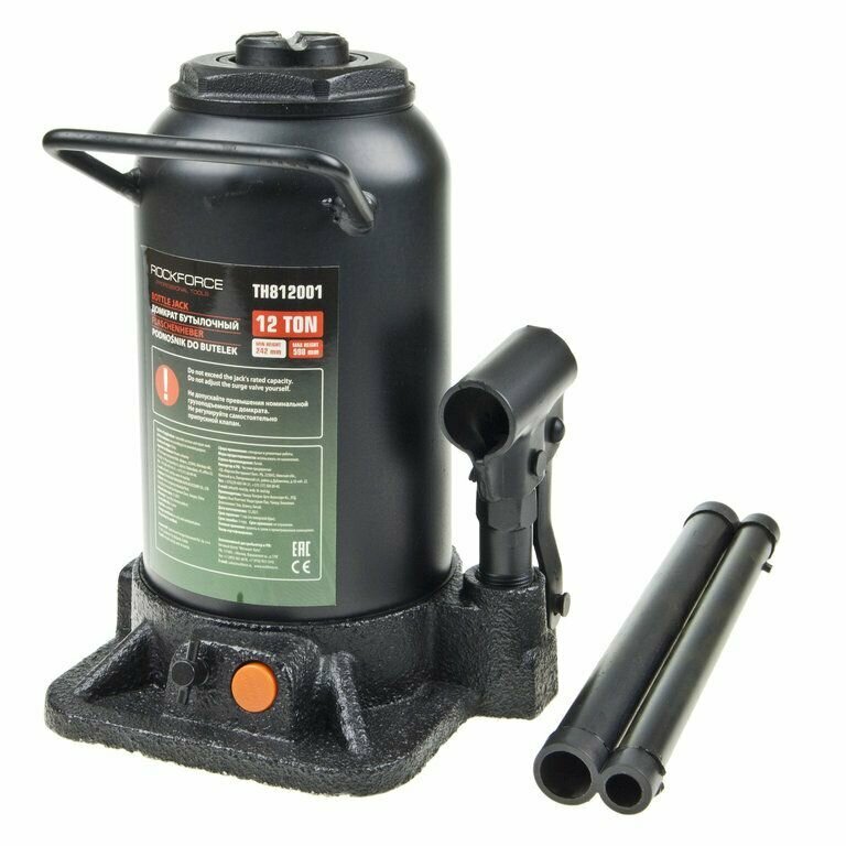 Домкрат Домкрат бутылочный гидравлический двухштоковый ''Profi''12т с клапаном (h min-242мм, h max-598мм,ход штока-296мм,ход винта-60мм) Rock FORCE RF-TH812001(DS)