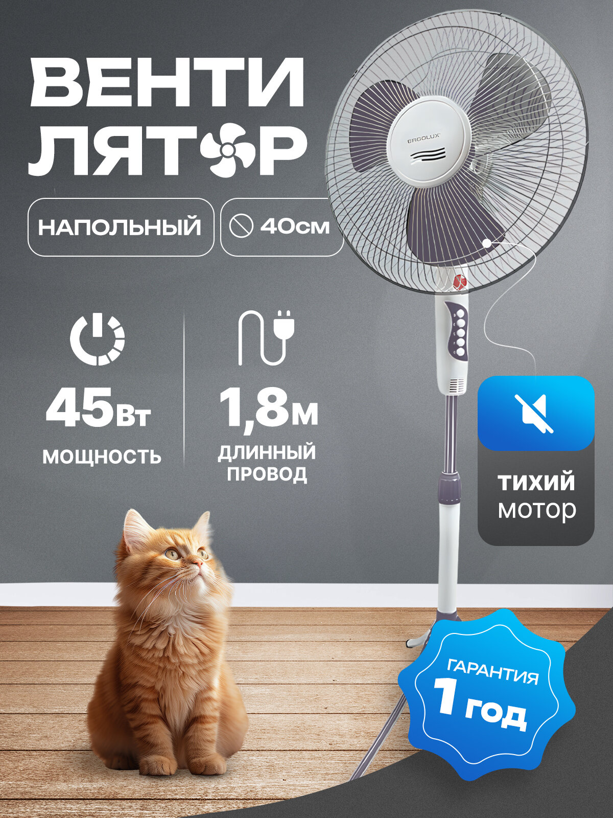 Вентилятор напольный ERGOLUX ELX-FS02-C31, 45Вт 1 990 ₽ Подробнее