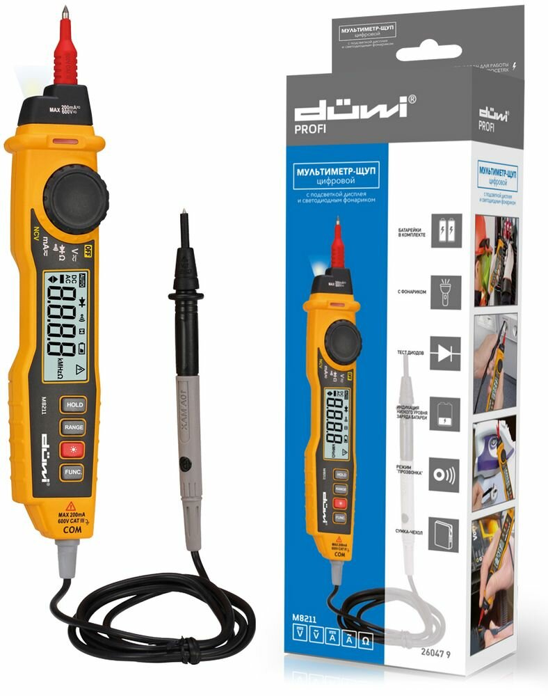 Мультиметр-пробник цифровой в форме щупа с фонариком и подсветкой M8211, PROFI, color box, duwi 26047 9