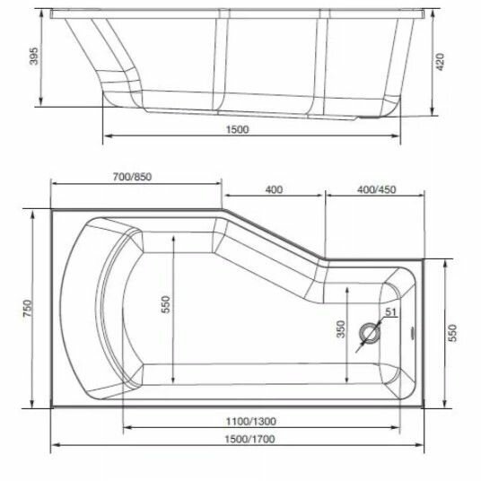 Ванна акриловая 170x75 см асимметричная правый угол Marka One Convey 01кон1775п