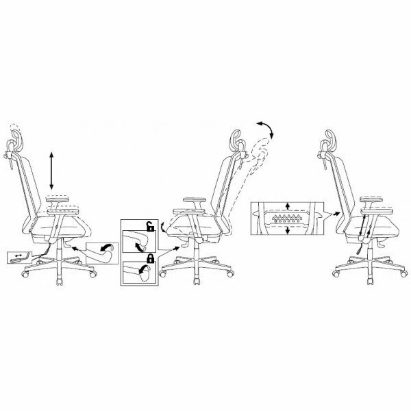 | Регулировки | высоты подголовника, наклона подголовника, степени жесткости качания, поддержка поясницы, высоты сиденья, глубины сиденья, наклона всего кресла, высоты подлокотников, подлокотников по горизонтали (3D) |