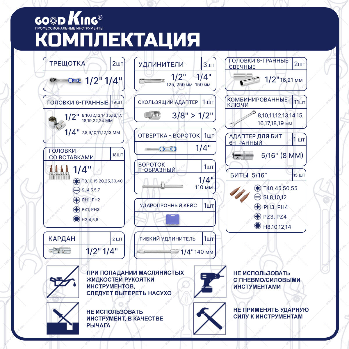 B-10078 Набор инструментов для авто 78 предметов 1/4 1/2 трещотка 72 зуба Goodking B-10078 . 6 473 ₽ Подробнее