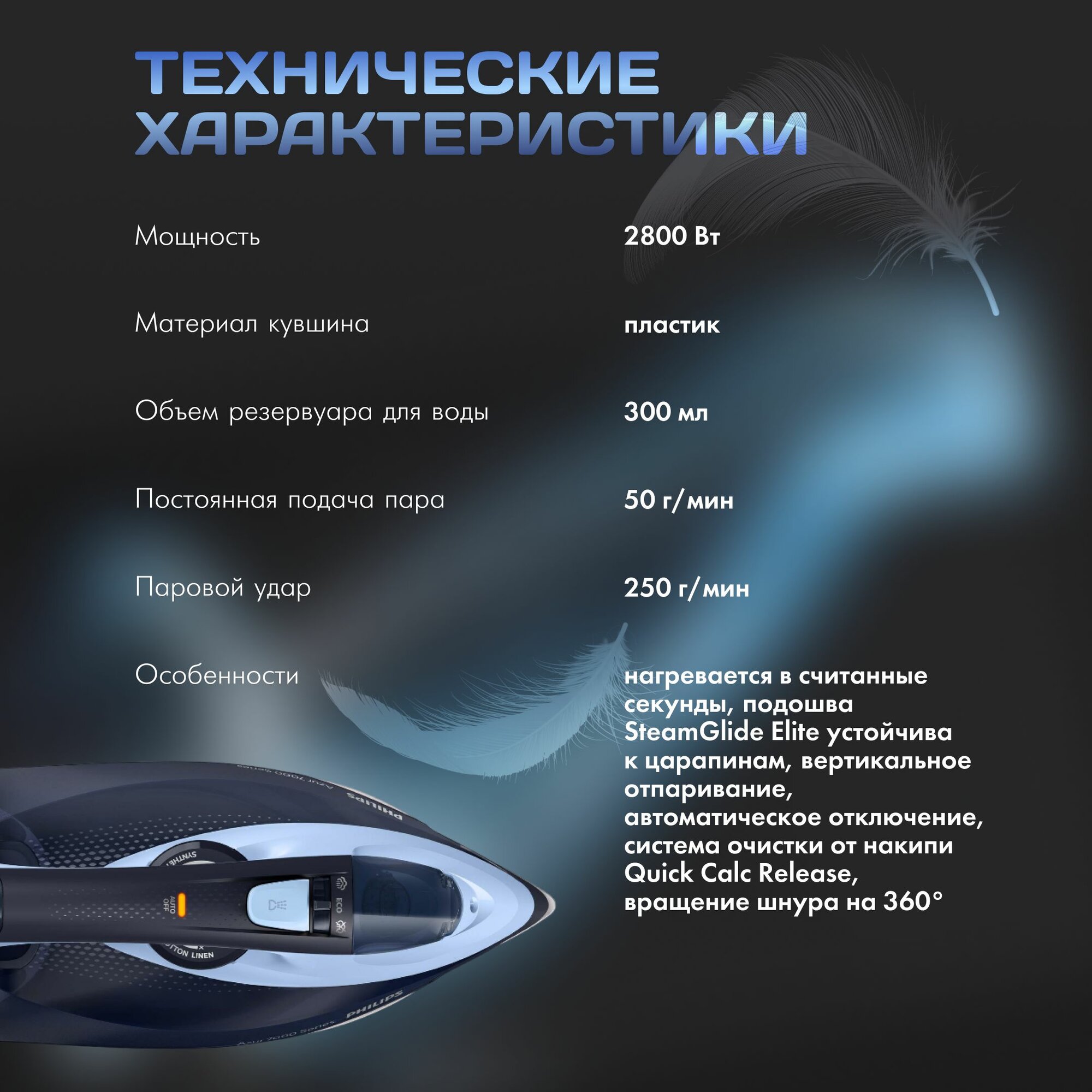 Утюг Philips DST3031/20, мощность 2400 Вт, подача пара 40 г/мин, резервуара для воды 300 мл, синий