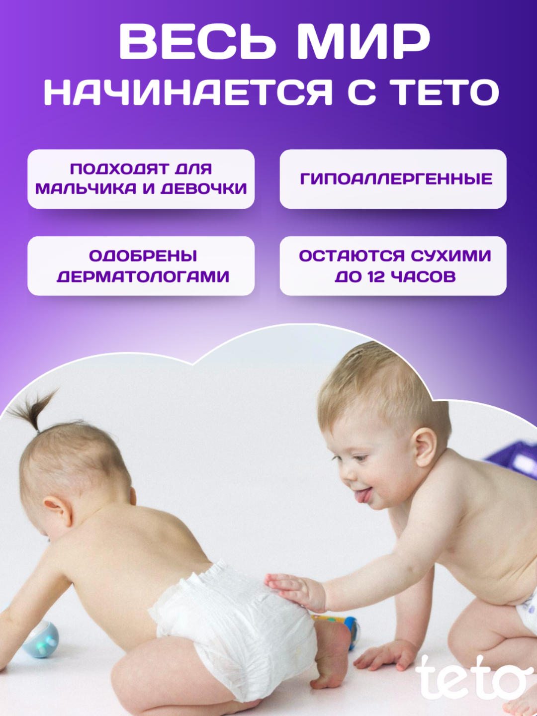 Teto Подгузники для детей Памперсы для мальчиков и девочек размер 5 XL (12-20 кг) 52 шт в упаковке 1 196 ₽ Подробнее