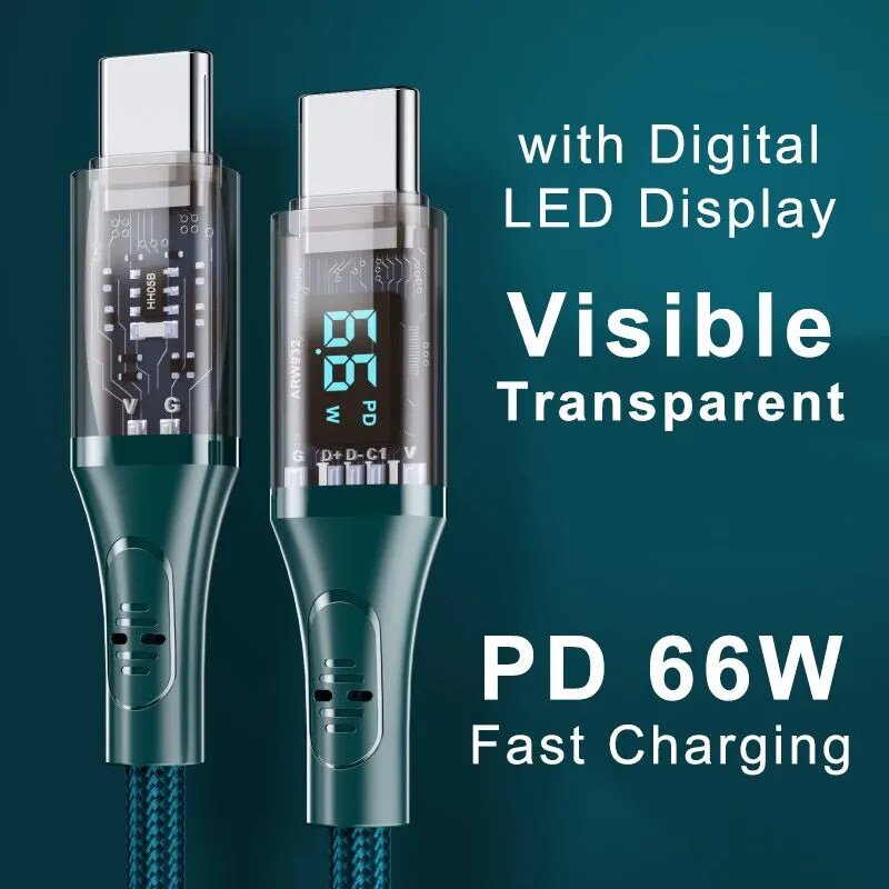 Зарядки для гаджетов Кабель Type-C-Type-C для быстрой зарядки PD 66 W, 6 Ампер, 1.2 метра, дисплей с измерителем тока, зарядка для Huawei, Xiaomi, Samsung (Зеленый)