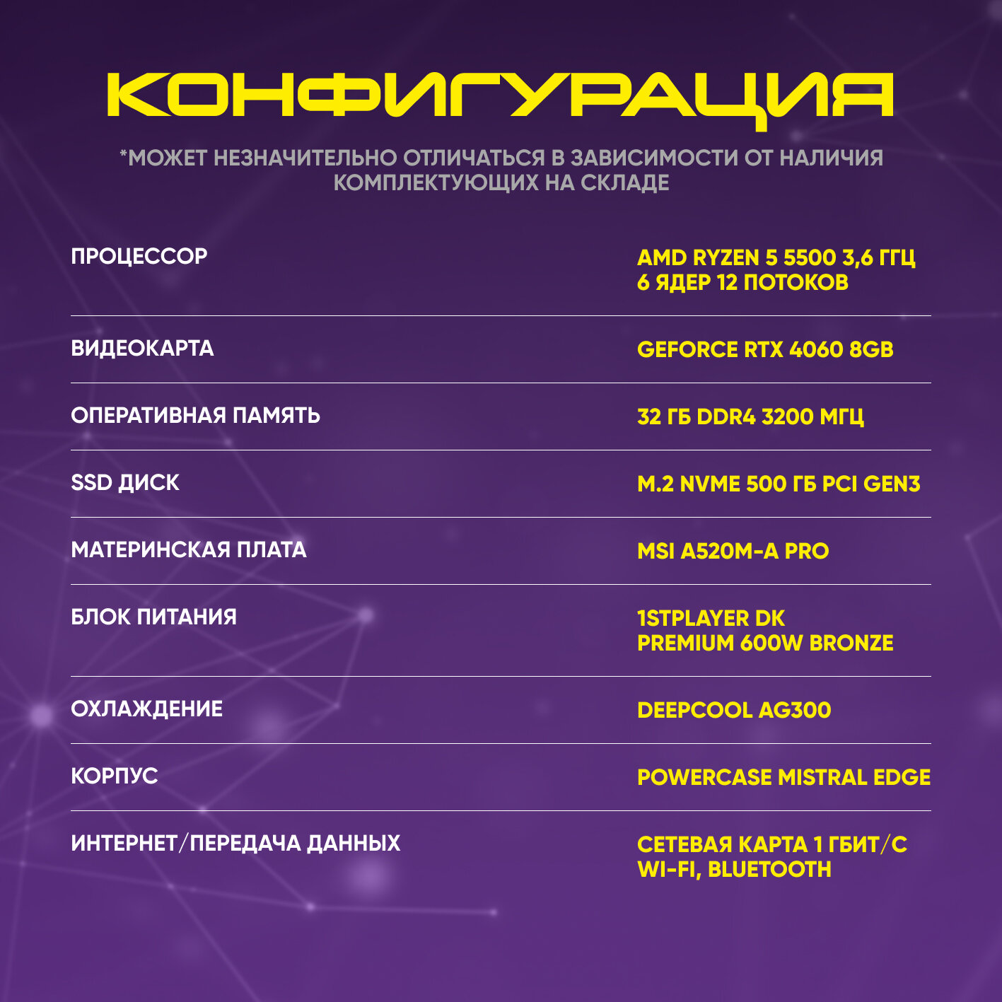 Системный блок игровой AURORA GAMING ПК Игровой компьютер (AMD Ryzen 5 5500 (3.6 ГГц), RAM 16 ГБ, SSD 500 ГБ, AMD Radeon RX 7600 (8 Гб), Windows 11 Pro), черный матовый 200 000 ₽ Подробнее