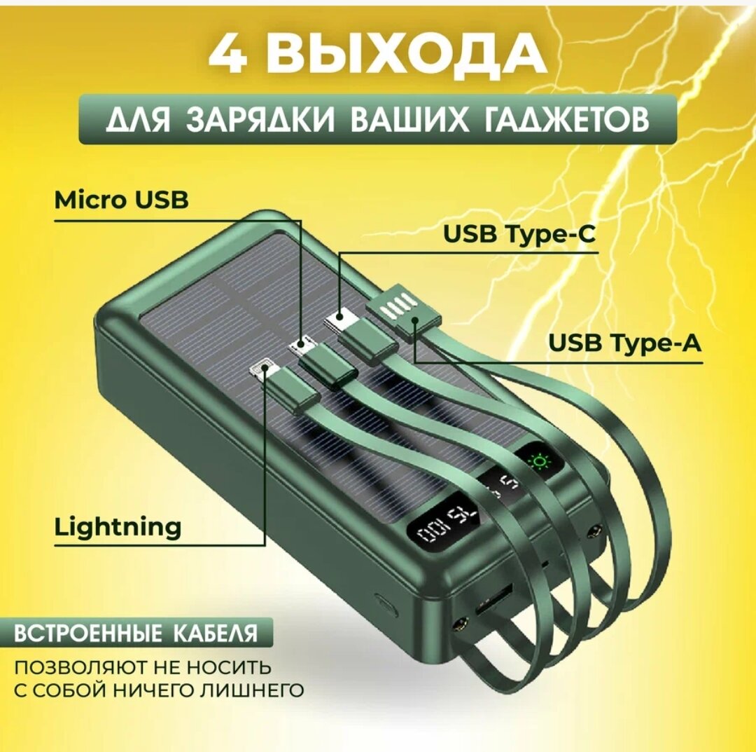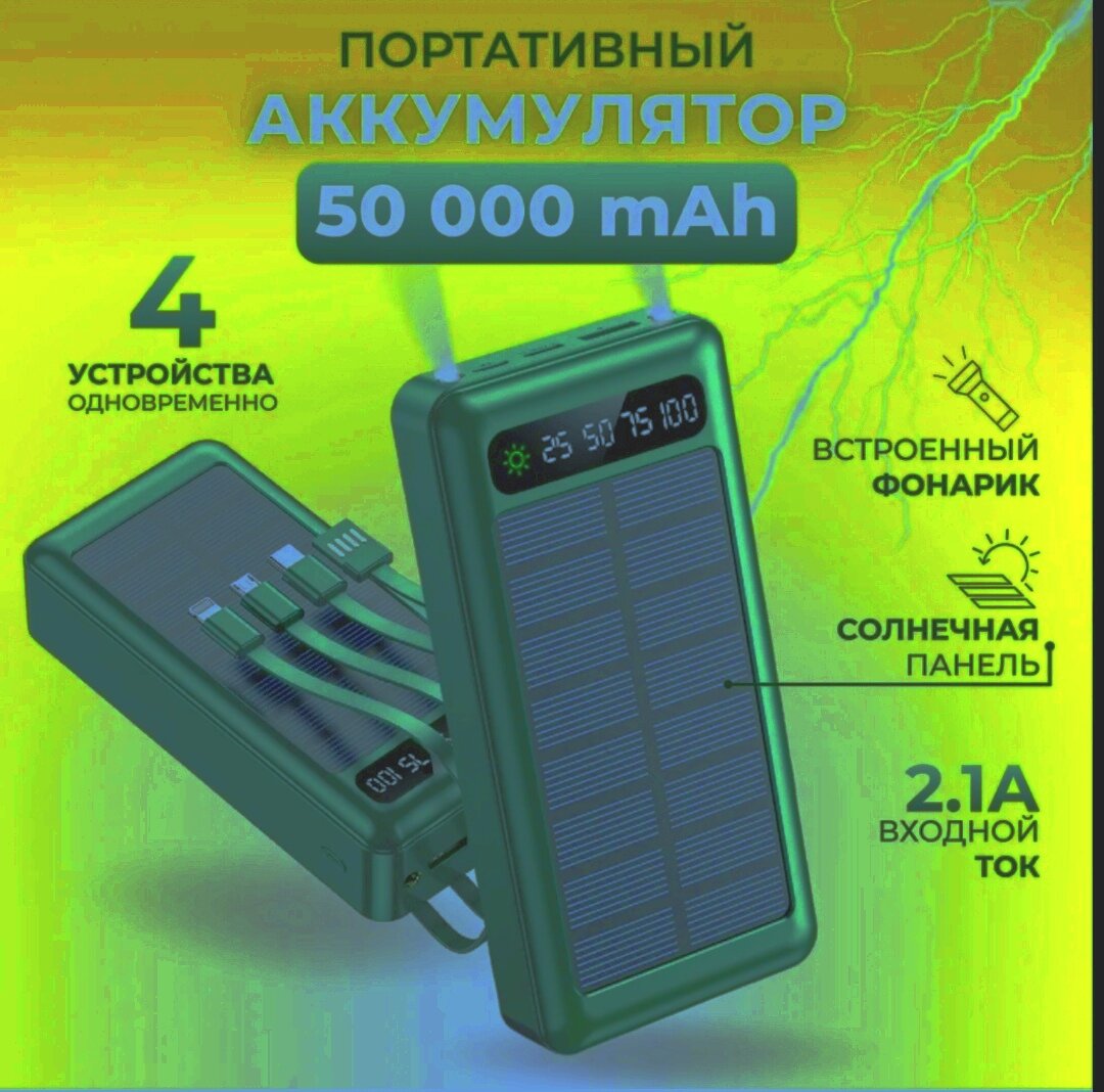 Powerbank Универсальный Powerbank 50000 mAh со встроенными кабелями, солнечная батарея/быстрая зарядка/ повербанк / повер банк/ солнечная зарядка/ внешний аккумулятор