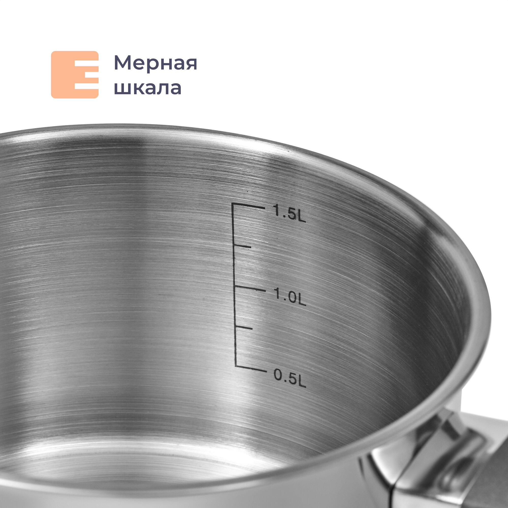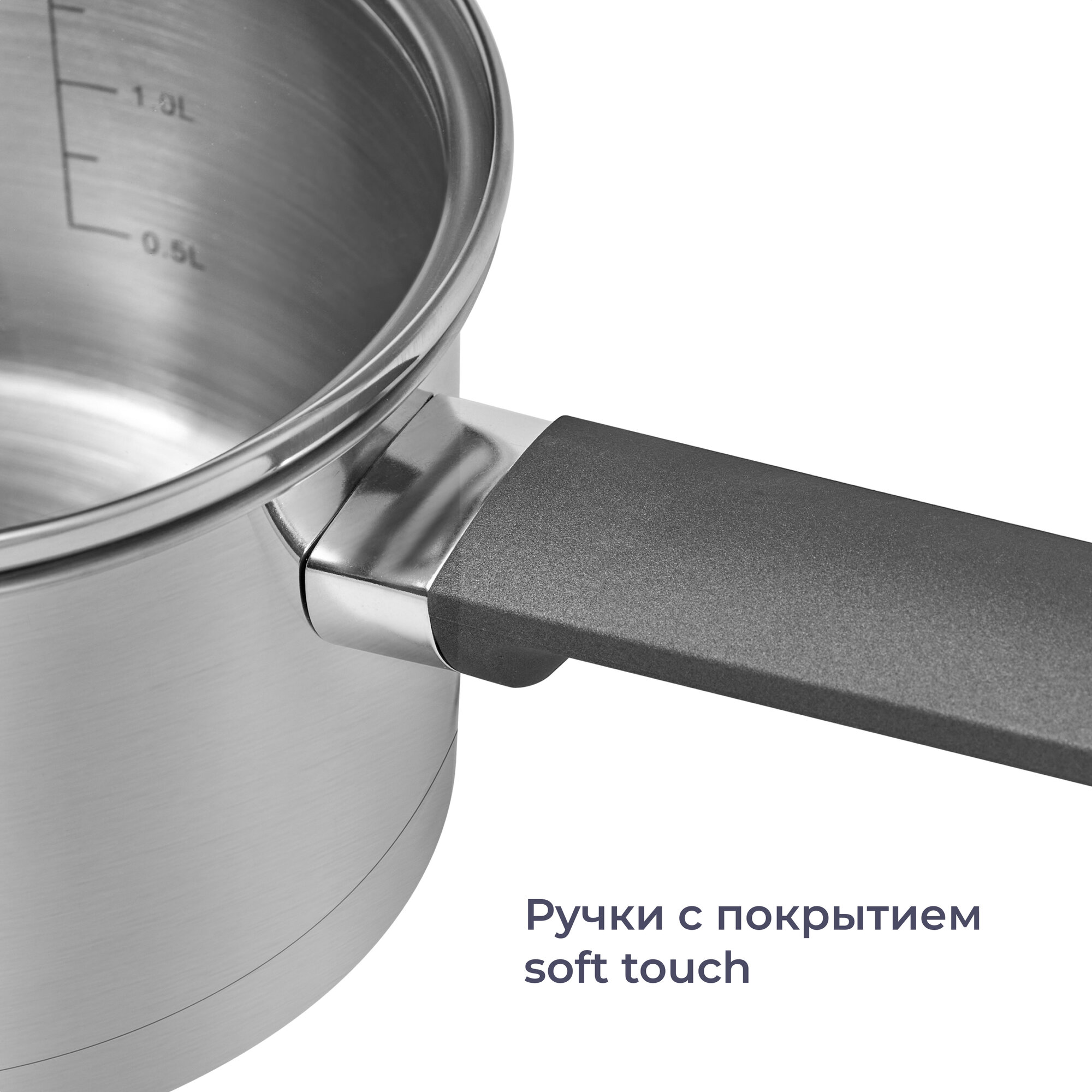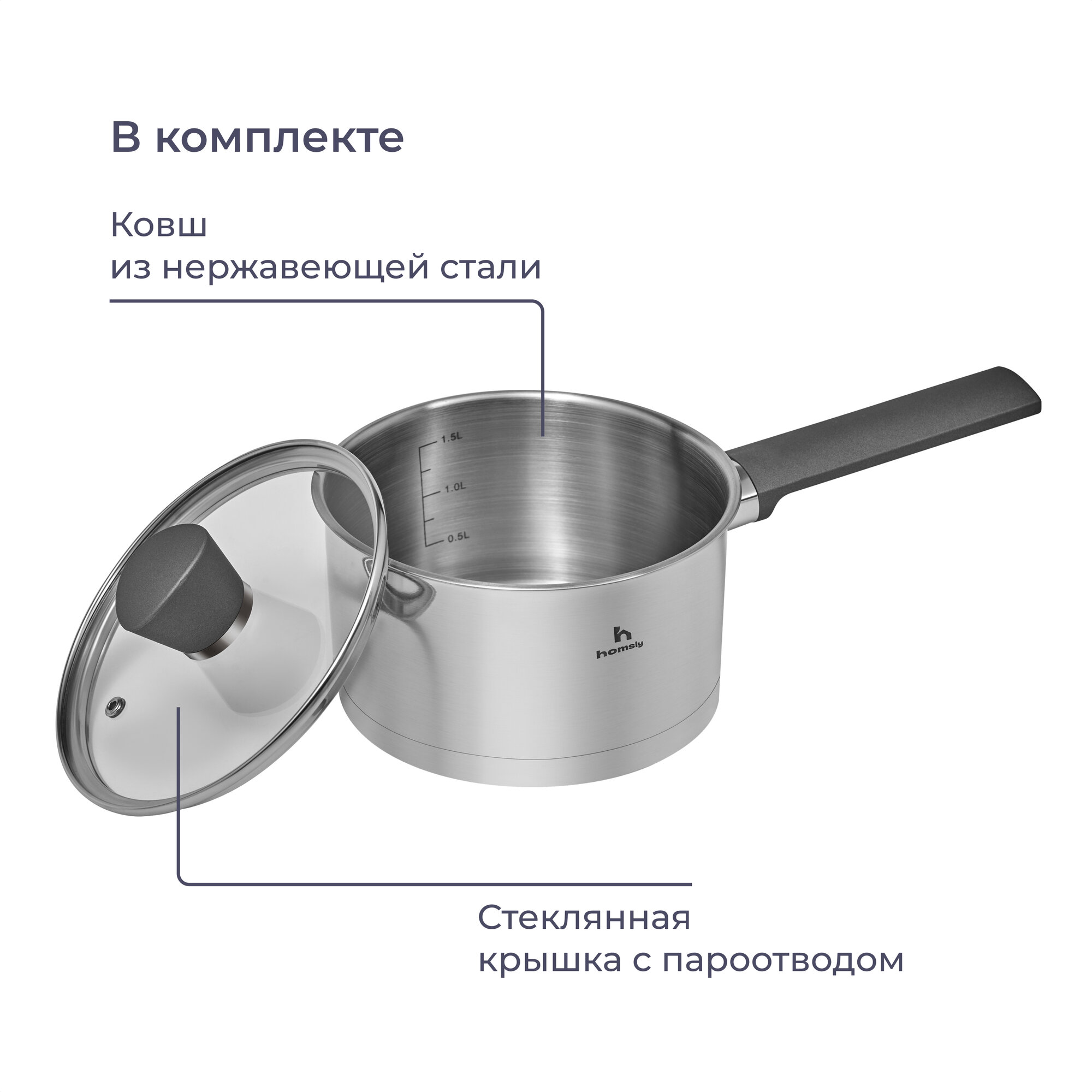 Кастрюли Ковш Homsly из нержавеющей стали, 1.9 л, ручка soft touch, со стеклянной крышкой