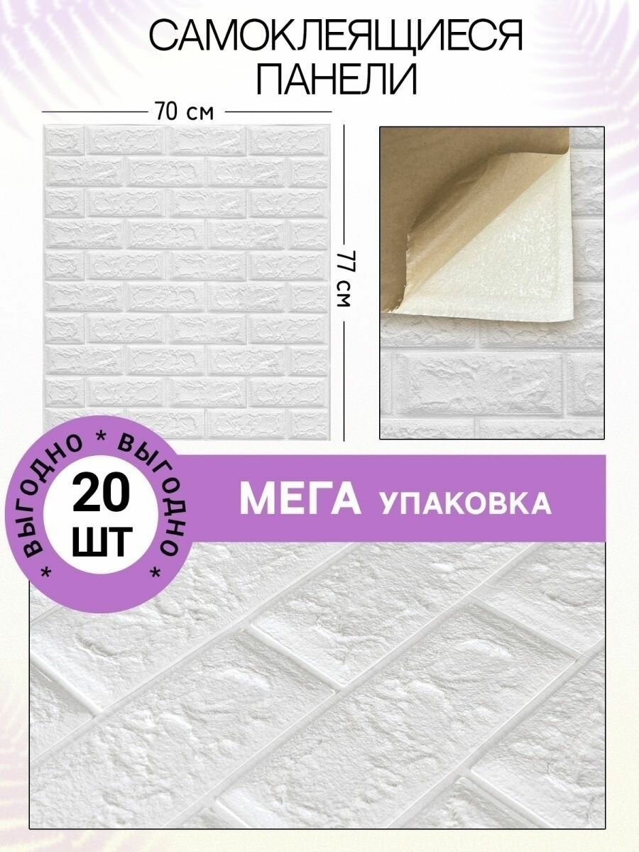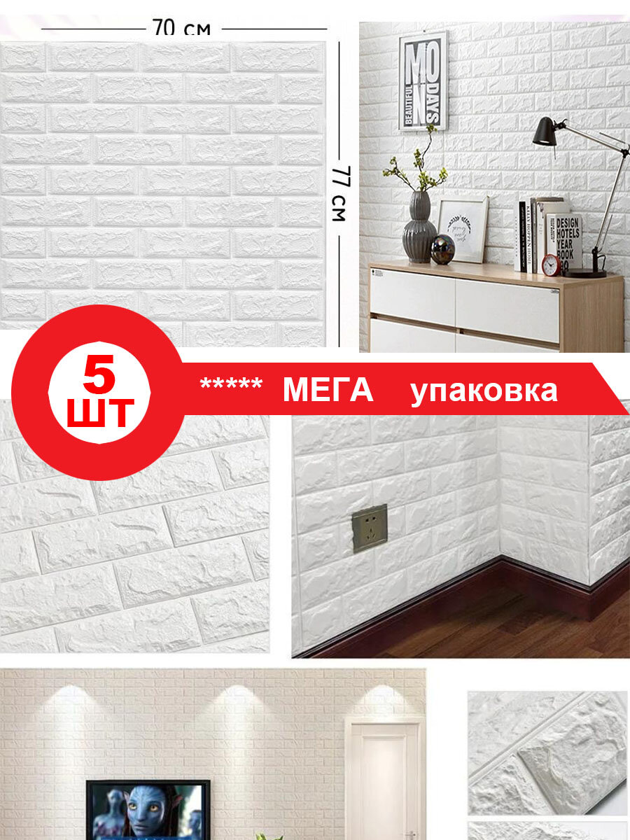 Плиты Самоклеящиеся 3Д панели пвх для стен и потолка/ белый кирпич/ 700*770, 5шт