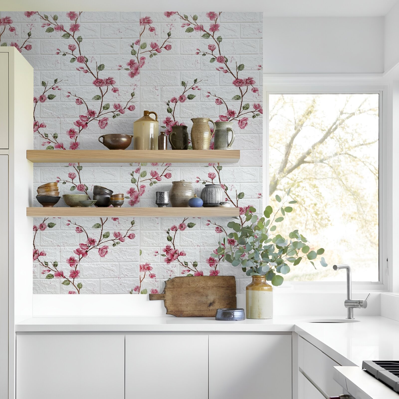 Плиты 3д самоклеющаяся панель для стен "Кирпич сакура белая" 10 шт. 700*770*4 мм обои с цветами для кухни моющиеся влагостойкие фартук на стену