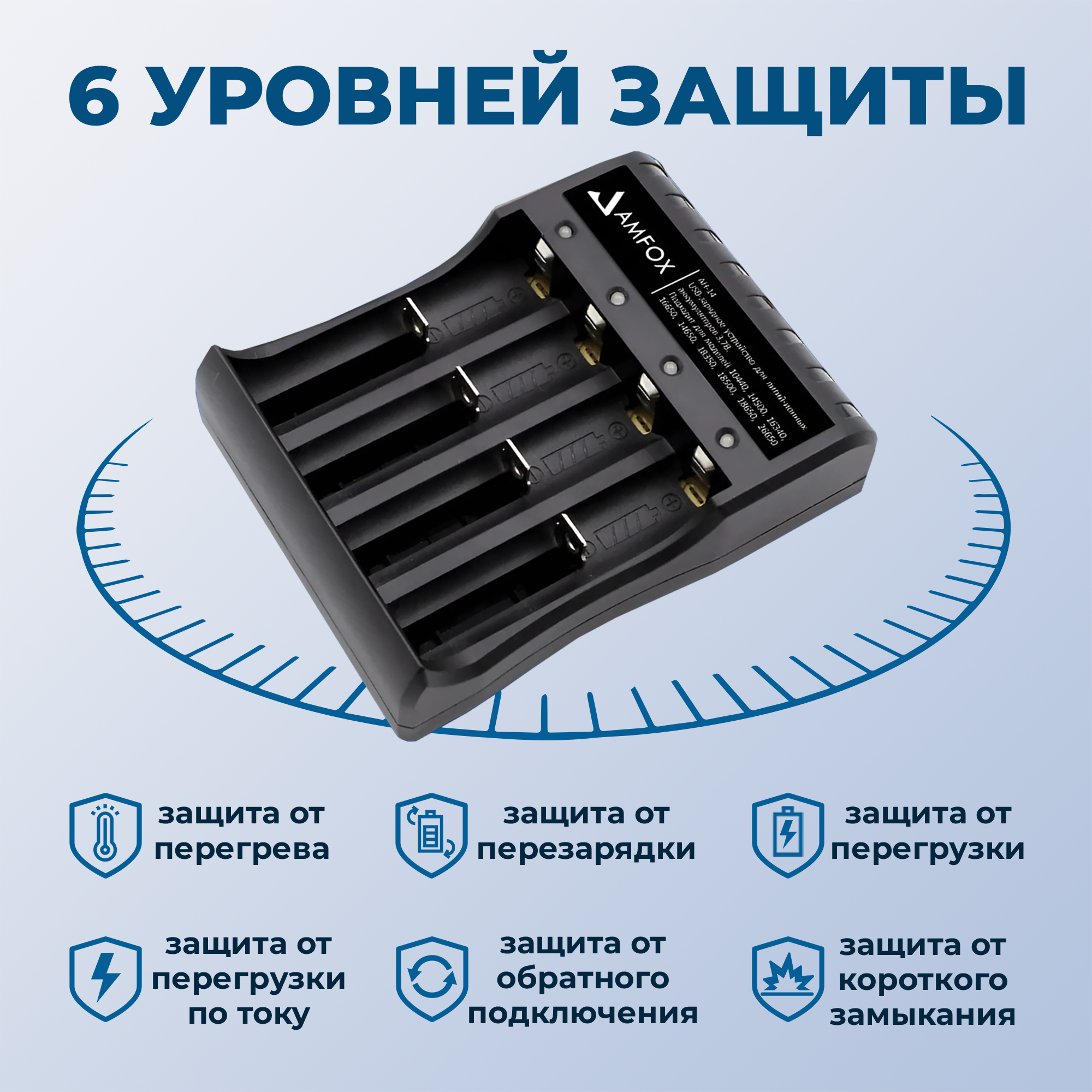 | Типоразмеры | 14500 / 16340 (CR123) / 18650 / 21700 / 26650 / 32650 |