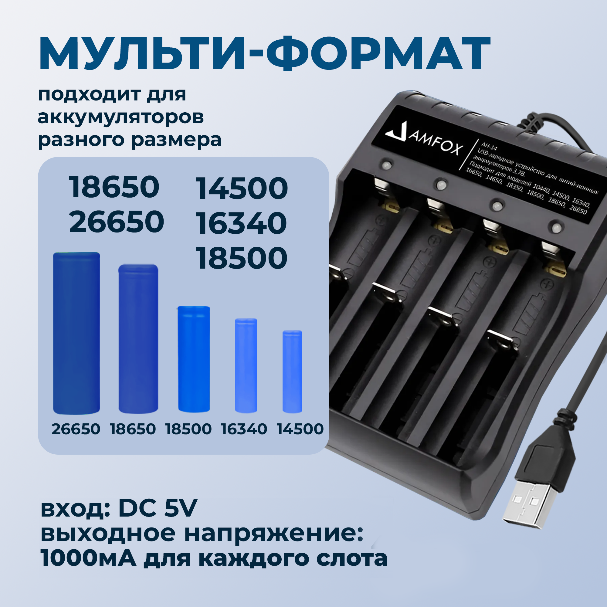 Зарядное устройство для Li-Ion аккумуляторных пальчиковых батареек ААА, AMFOX, AH-11, индикатор заряда, универсальный зарядник liitokala, черное 298 ₽ Подробнее