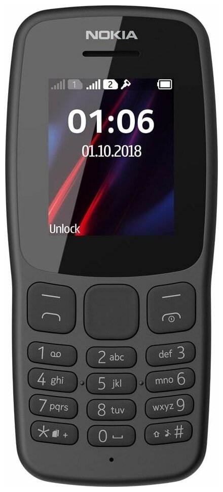 Лучшие цены. Сотовый телефон Nokia 106 (2018) - темно-серый моноблок с минималистичным дизайном и необходимым для повседневного общения базовым функционалом. Он получил 1.8-дюймовый дисплей с разрешением 160x128 пикселей и физическую клавиатуру, отличающуюся четким срабатыванием клавиш. Аппарат допускает подключение двух сим-карт и дает вам возможность пользоваться услугами двух операторов мобильной связи, выбирая их наиболее привлекательные тарифные предложения. Магазины в вашем городе.
