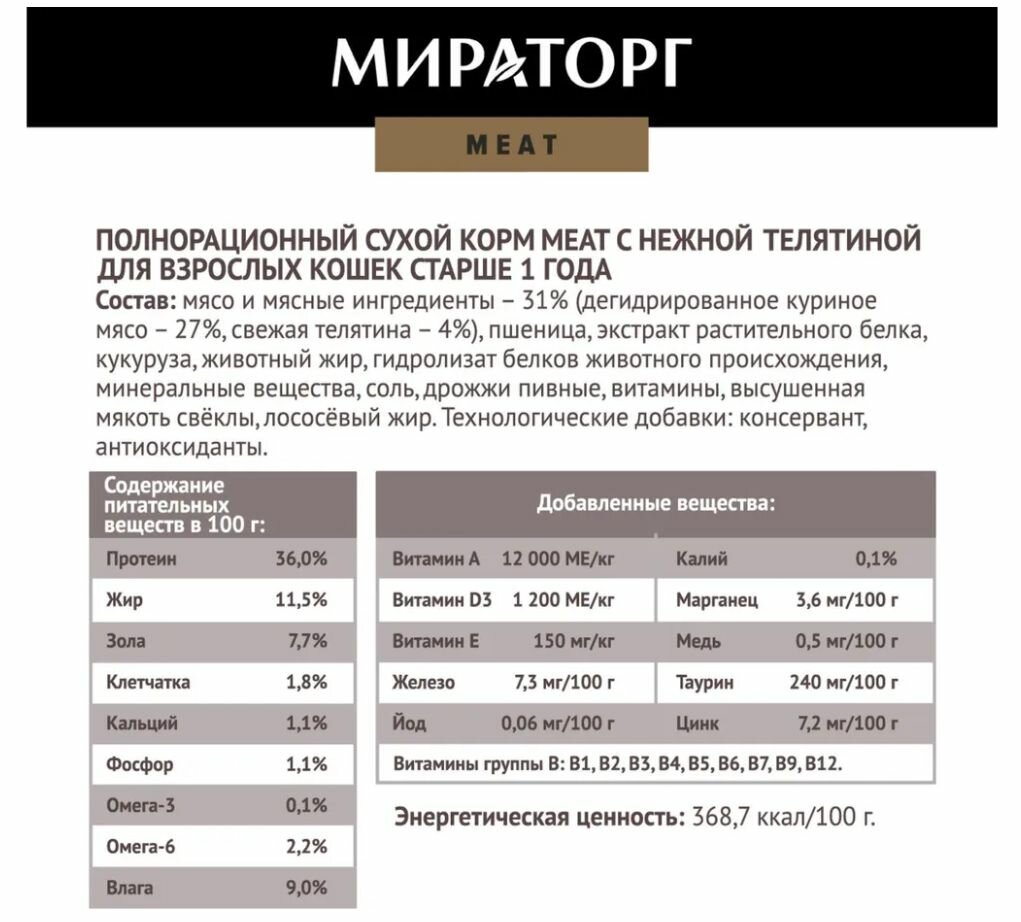 Корм сухой Мираторг Meat с нежной телятиной для взрослых кошек старше 1 года, 1,5 кг