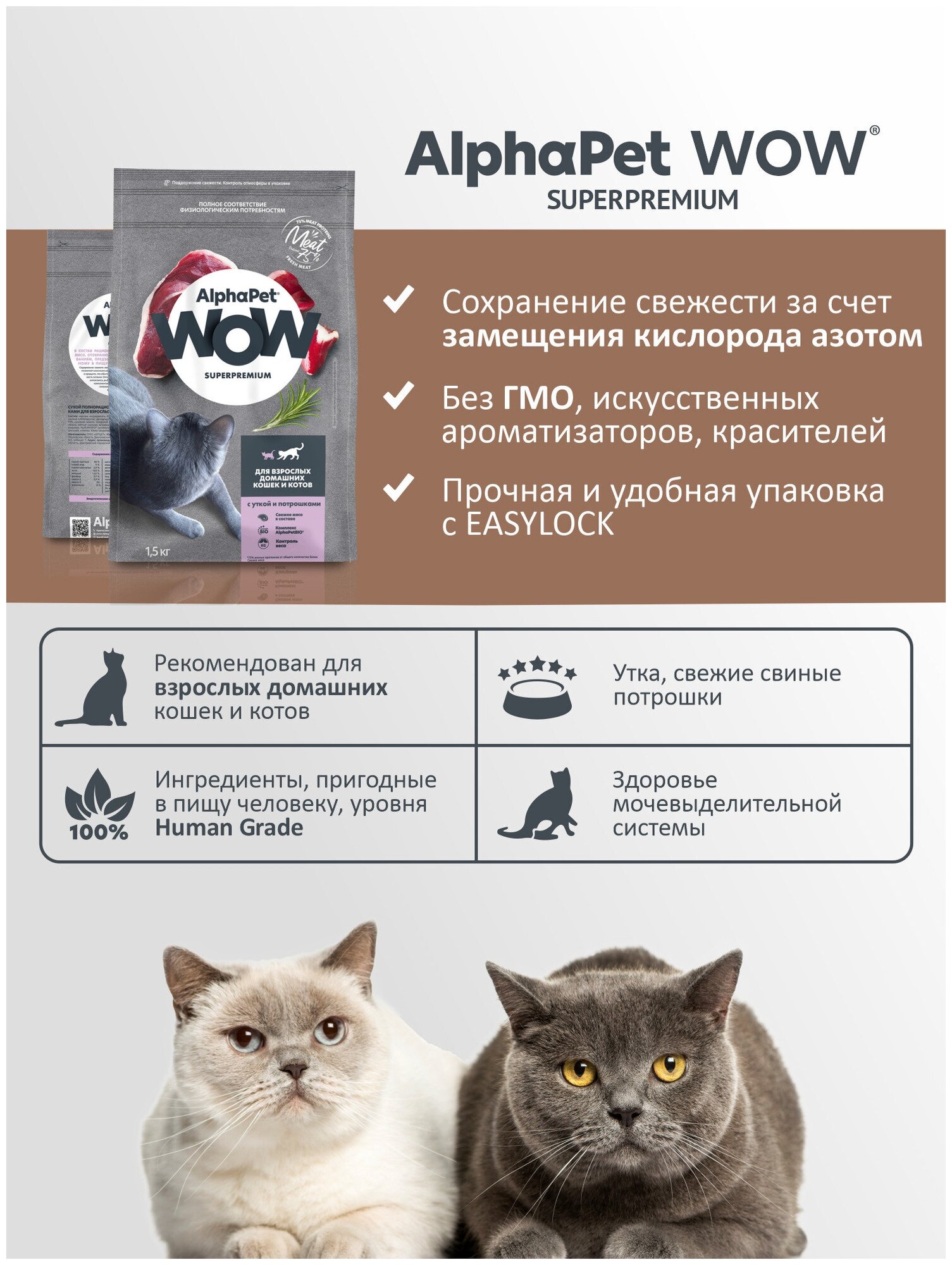 Корм для кошек Корм сухой Alphapet Superpremium WOW, с уткой и потрошками для взрослых домашних кошек и котов, 1,5 кг