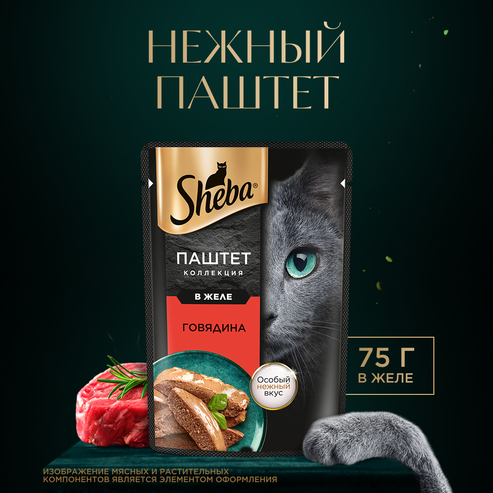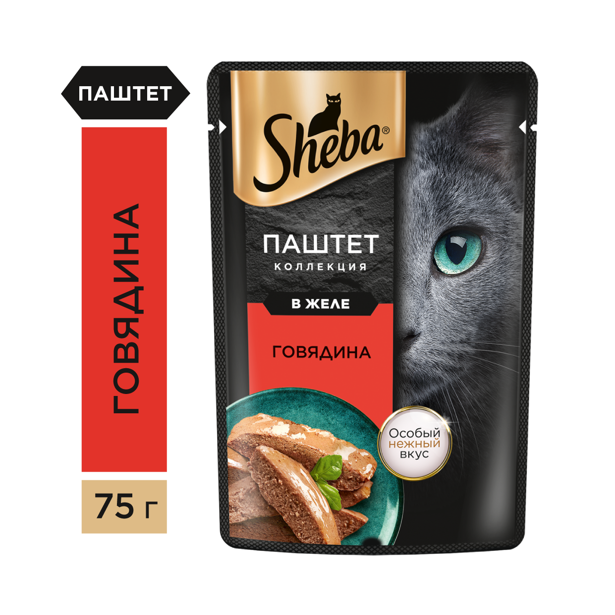 Корм для кошек Влажный корм для кошек SHEBA Нежный паштет в желе, с говядиной, 56 шт по 75 г