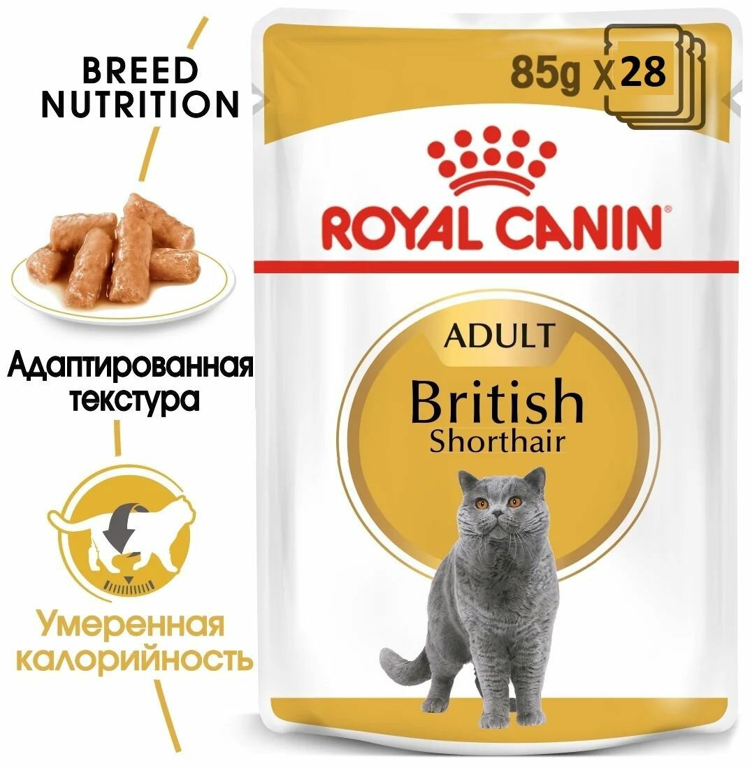 Корм для кошек Royal Canin Упаковка 28шт. Паучи Кусочки в соусе для Британской Короткошерстной кошки старше 12 месяцев British Shorthair, 85г*28 2.38 кг